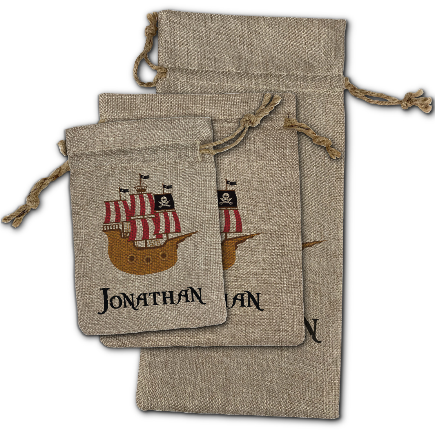 We sell our Burlap Gift Bags in 3 variant sized bags. Made with burlap polyester, each personalized bag can be secured with a twine drawstring pull. Your custom design is available to print on one side or both sides - completely up to you! The sizes of the bags measure approximately 4.5" x 6.5" for the smallest size, 6.5" x 8.0" for the medium size, and 6.5" x 13.5" for the large-sized bag.