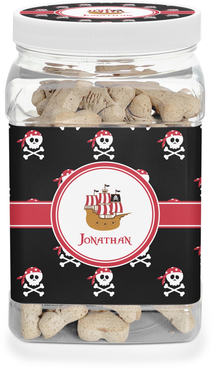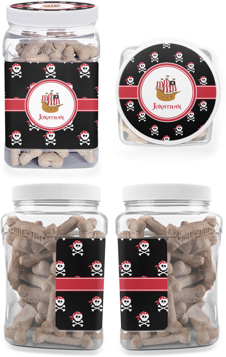 This half gallon jar, made from a sturdy plastic, is the perfect way to keep treats from any naughty pet paws, while still keeping them ready on hand for when your pup performs an impressive trick. This dog cookie jar features a screw-on, white lid that displays your personalized design on a vinyl sticker. We apply another customized sticker that wraps around the front and sides of the jar. Our dog treat jar also has indentations on the rear ends of the sides, which allows for convenient handling, and its square frame allows for easy storage.