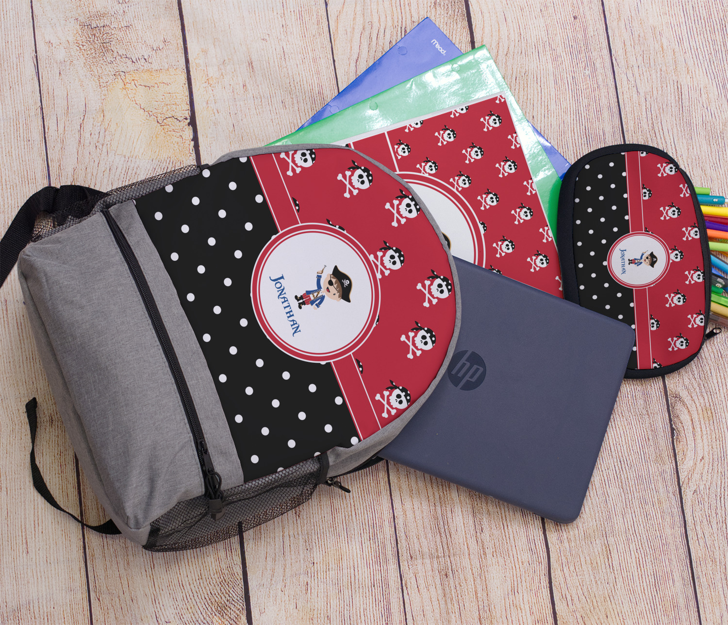A wide band of red, trimmed in white highlight the pirate boy in the circle label. Add your personalization in the label to complete the look.