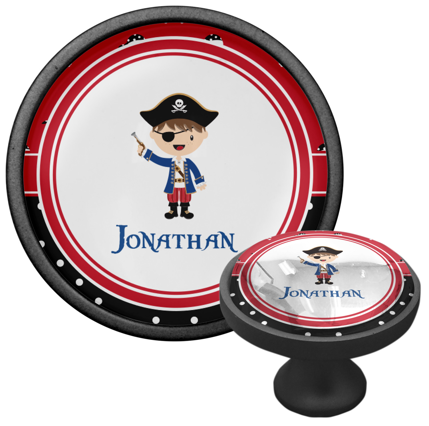 A wide band of red, trimmed in white highlight the pirate boy in the circle label. Add your personalization in the label to complete the look.