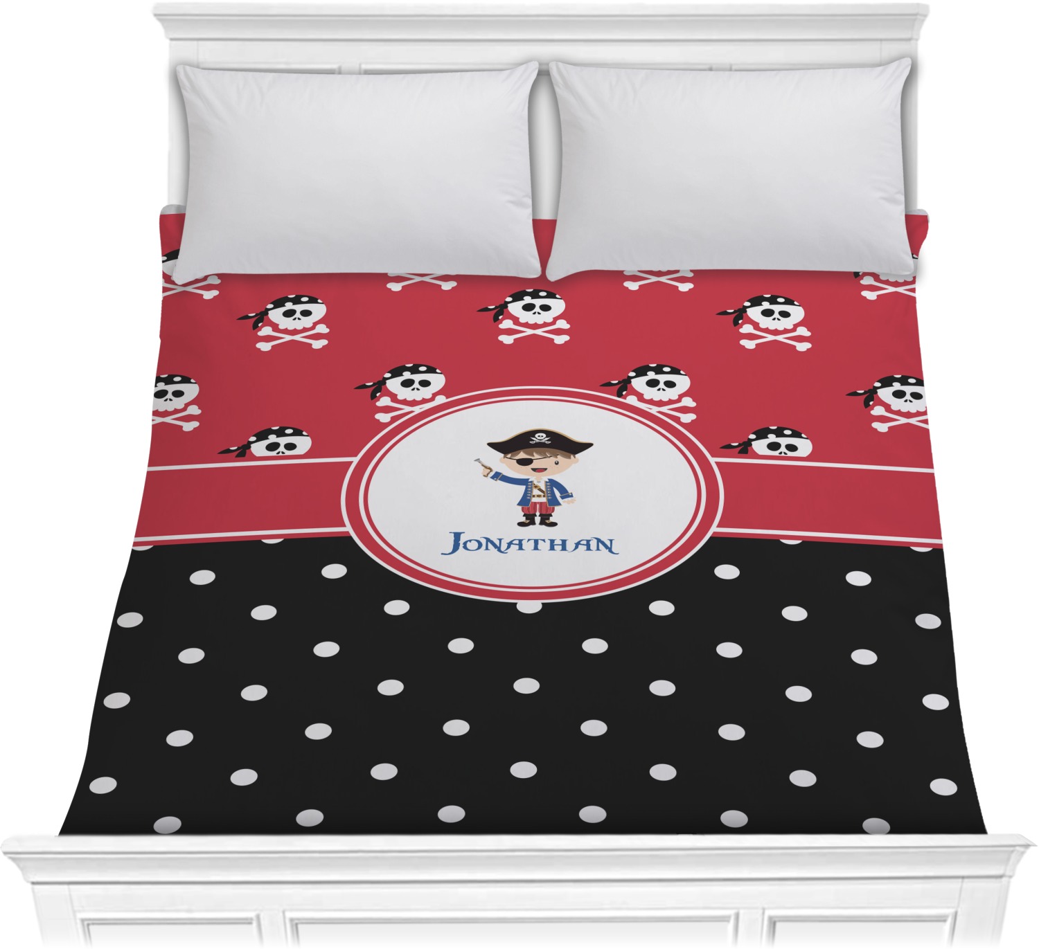Ahoy there matey, do you have a pirate boy on your hands? If so, then he is sure to love this classic black, red, and white skull and crossbones pirate print. The skull and crossbones are highlighted using a backdrop of red. They are adorned with black and white polka dot dew rags. The coordinating bottom pattern of the black and white polka dots, taken from the skull and crossbones' dew rags, ties the entire design together.