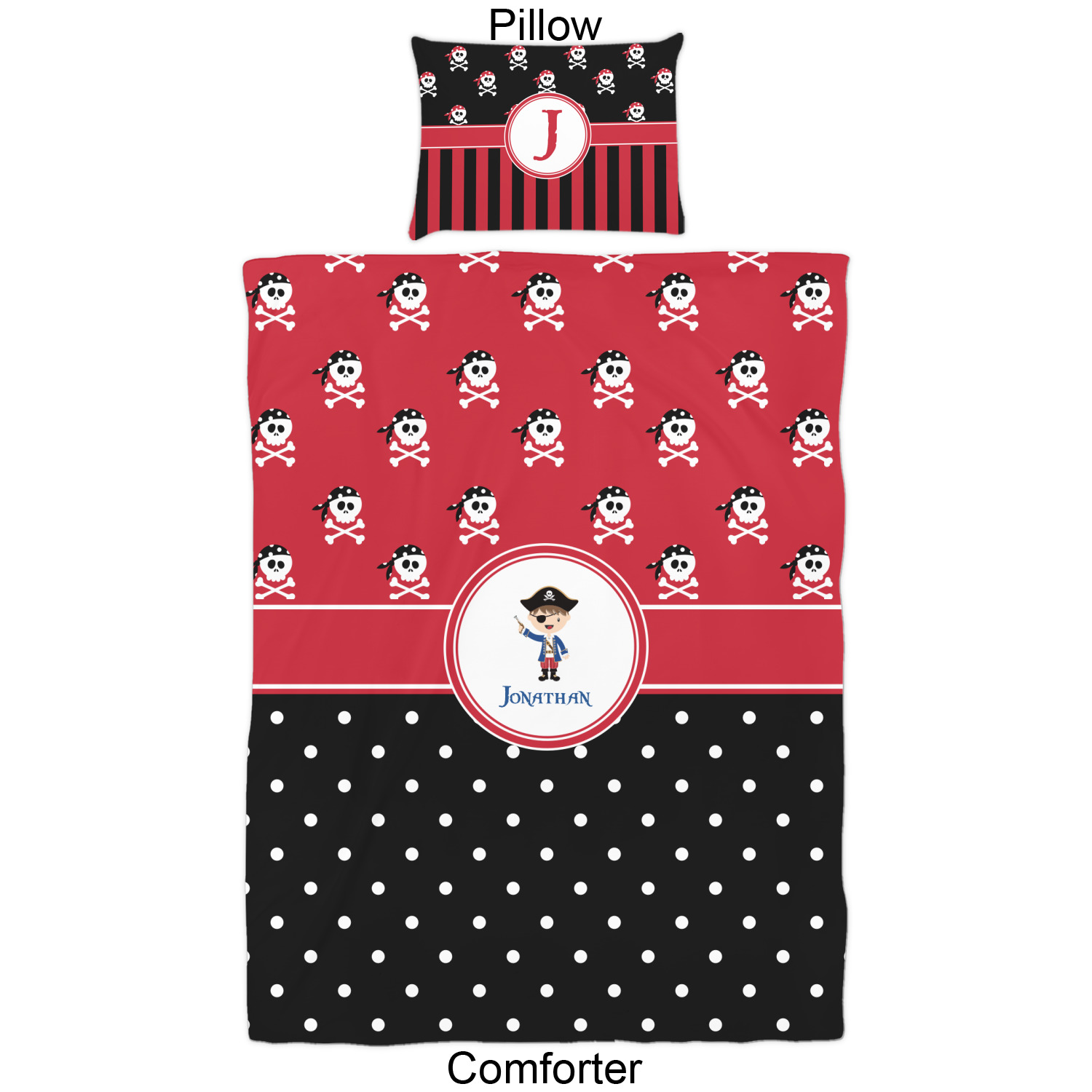 Ahoy there matey, do you have a pirate boy on your hands? If so, then he is sure to love this classic black, red, and white skull and crossbones pirate print. The skull and crossbones are highlighted using a backdrop of red. They are adorned with black and white polka dot dew rags. The coordinating bottom pattern of the black and white polka dots, taken from the skull and crossbones' dew rags, ties the entire design together.