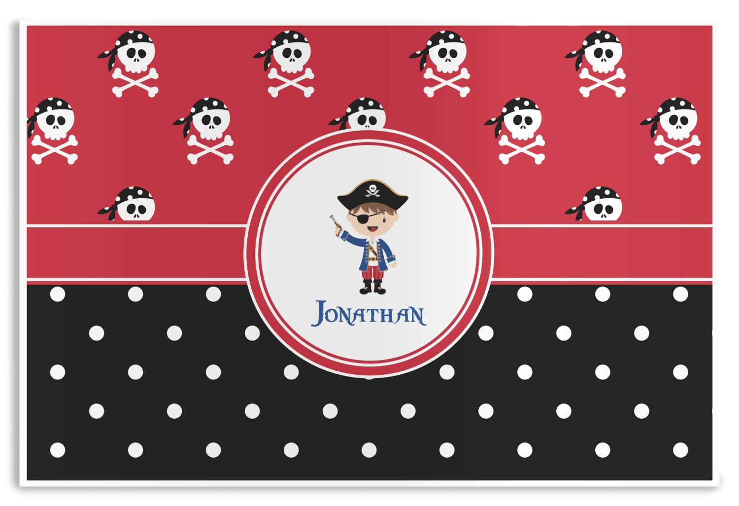 A wide band of red, trimmed in white highlight the pirate boy in the circle label. Add your personalization in the label to complete the look.