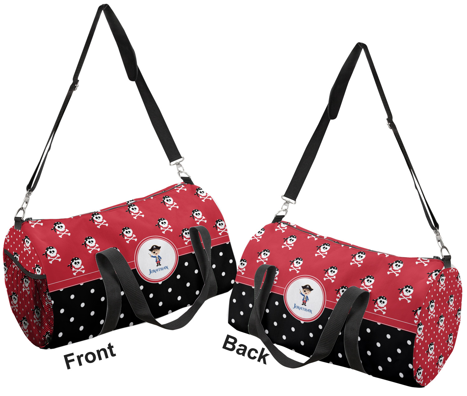 This duffle is a sturdy bag made of a canvas material. It comes in two sizes: Small (19"W x 9.5"H x 9.5"D) and Large (23"W x 12"H x 12"D). The bag is a cylindrical shape with a black adjustable strap and two handles. On one side is an elastic pouch to put a waterbottle or other small item. Your product will be sublimated with your design and is able to be designed on the front, back, and sides. Be sure to remember that the straps may cut into parts of your design if you upload your own artwork.
