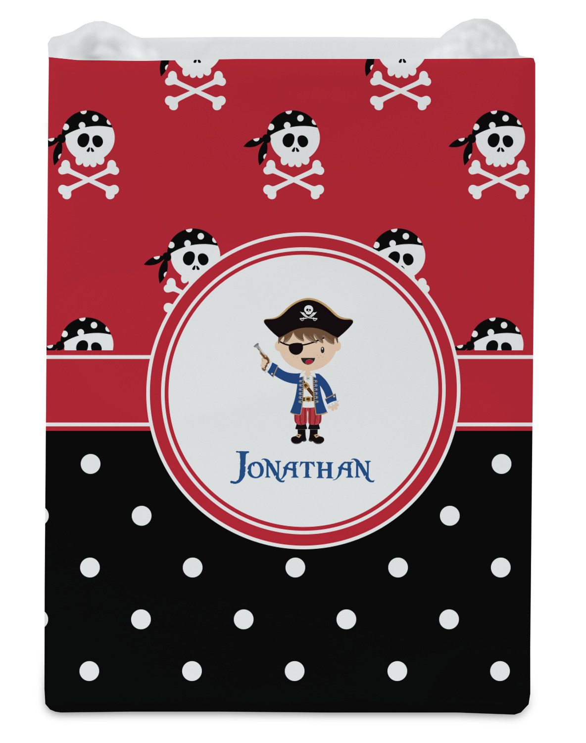 A wide band of red, trimmed in white highlight the pirate boy in the circle label. Add your personalization in the label to complete the look.
