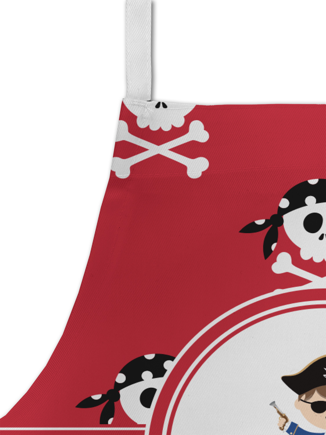 A wide band of red, trimmed in white highlight the pirate boy in the circle label. Add your personalization in the label to complete the look.
