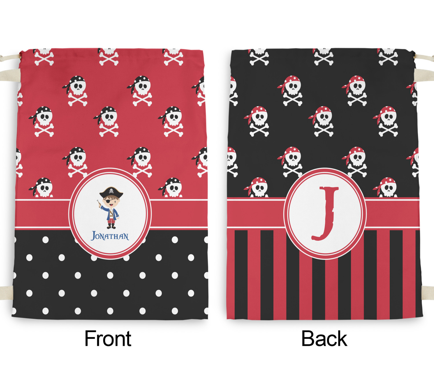 A wide band of red, trimmed in white highlight the pirate boy in the circle label. Add your personalization in the label to complete the look.