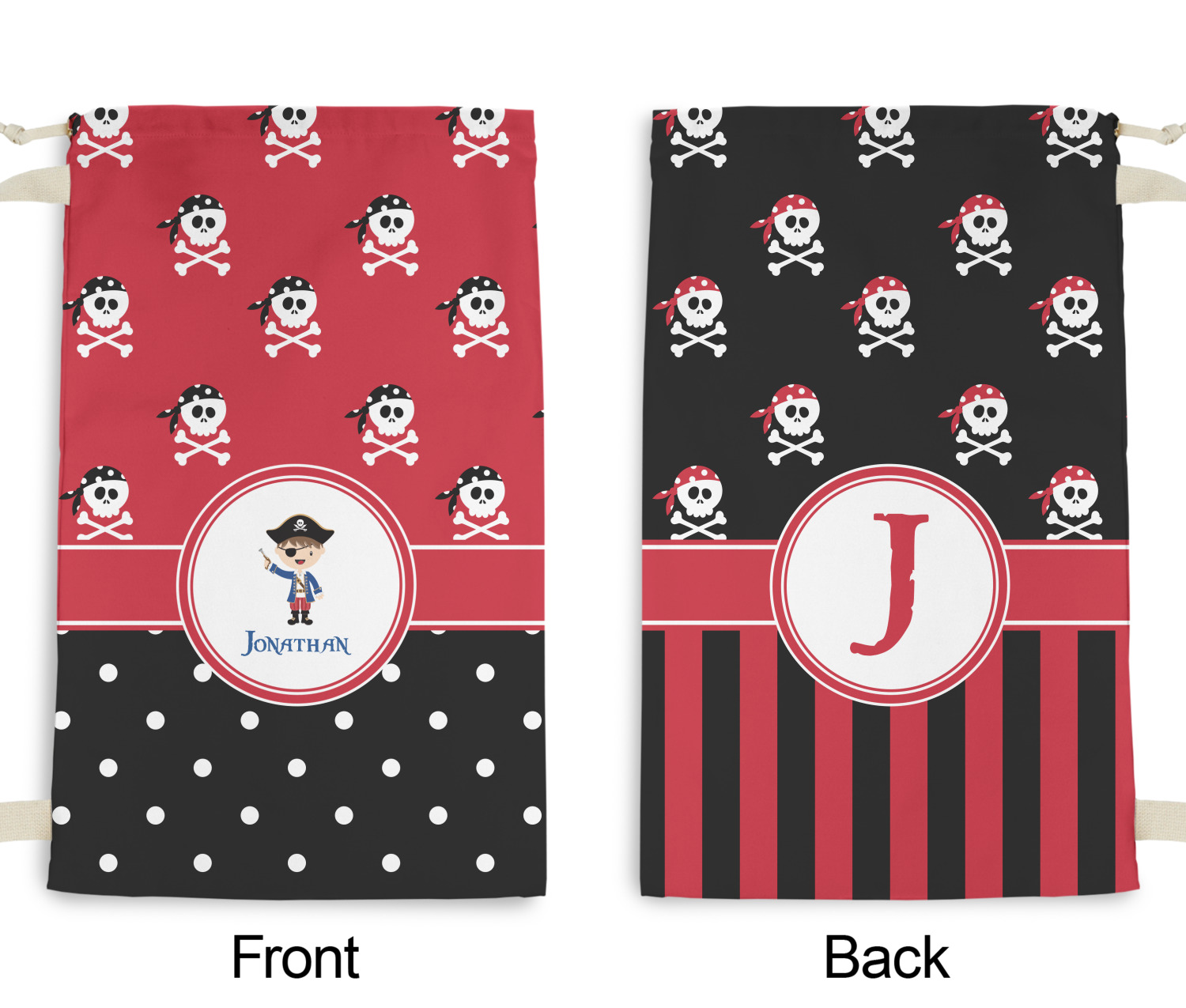 A wide band of red, trimmed in white highlight the pirate boy in the circle label. Add your personalization in the label to complete the look.
