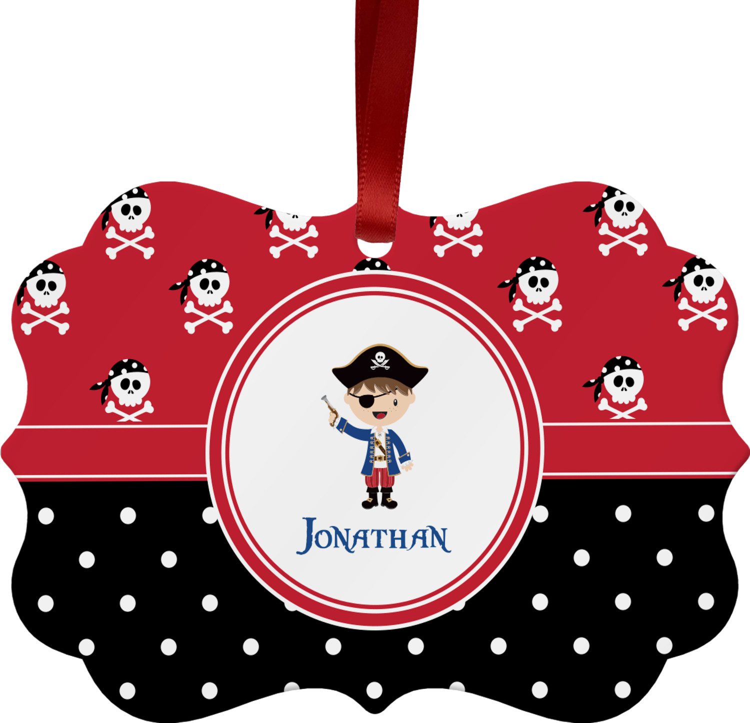 A wide band of red, trimmed in white highlight the pirate boy in the circle label. Add your personalization in the label to complete the look.
