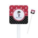A wide band of red, trimmed in white highlight the pirate boy in the circle label. Add your personalization in the label to complete the look.