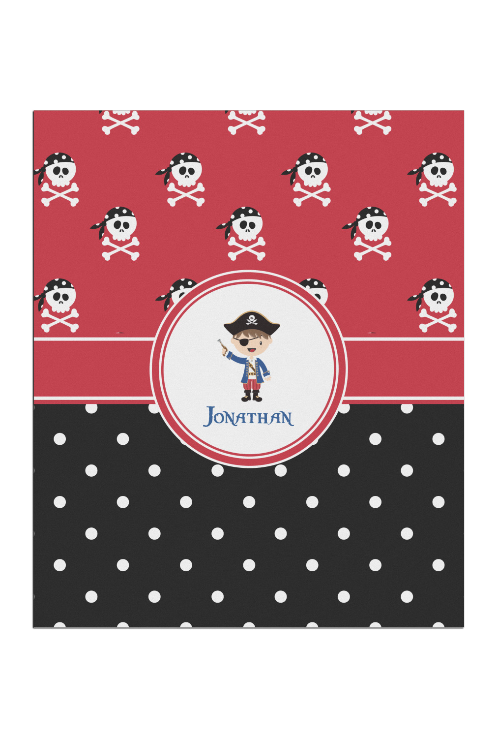A wide band of red, trimmed in white highlight the pirate boy in the circle label. Add your personalization in the label to complete the look.