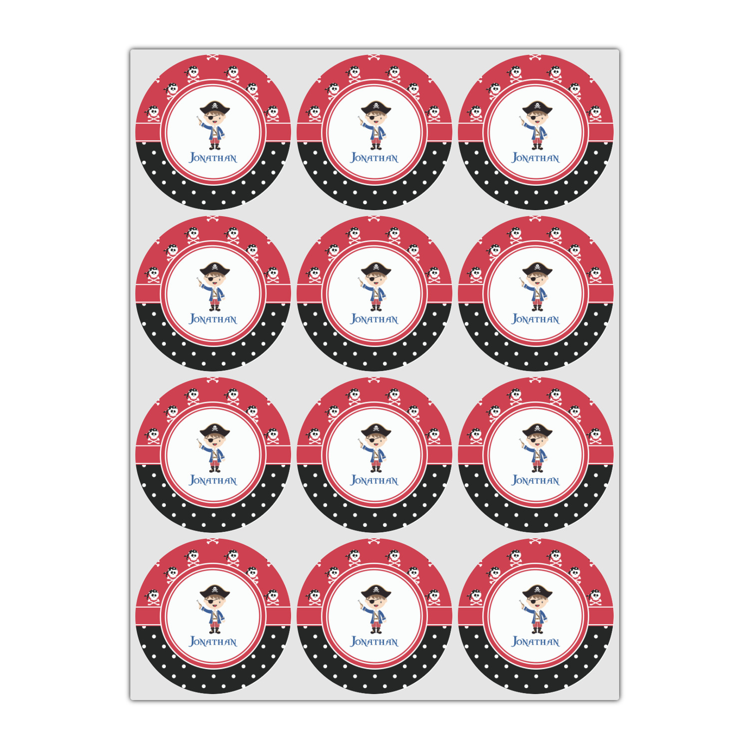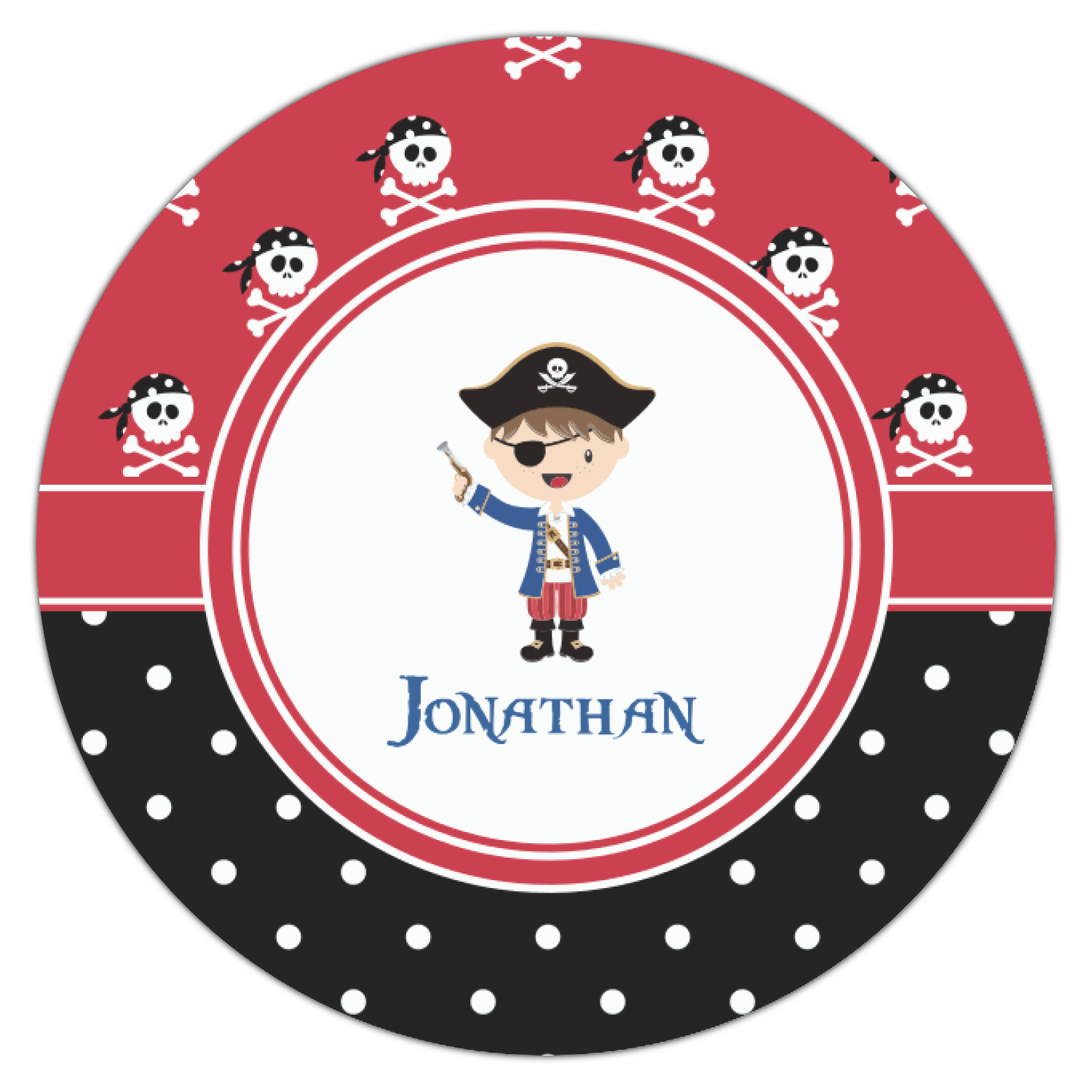 A wide band of red, trimmed in white highlight the pirate boy in the circle label. Add your personalization in the label to complete the look.