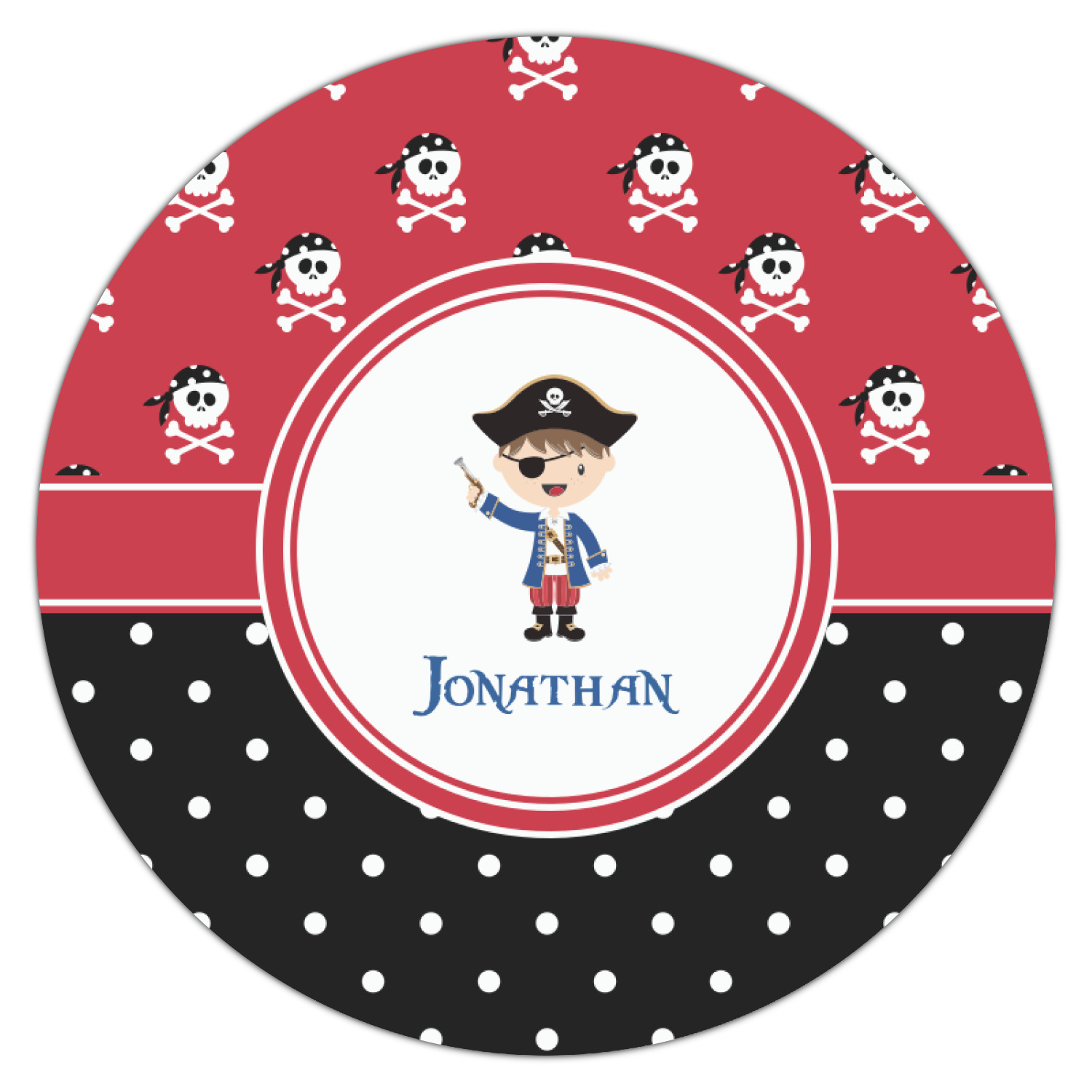 A wide band of red, trimmed in white highlight the pirate boy in the circle label. Add your personalization in the label to complete the look.