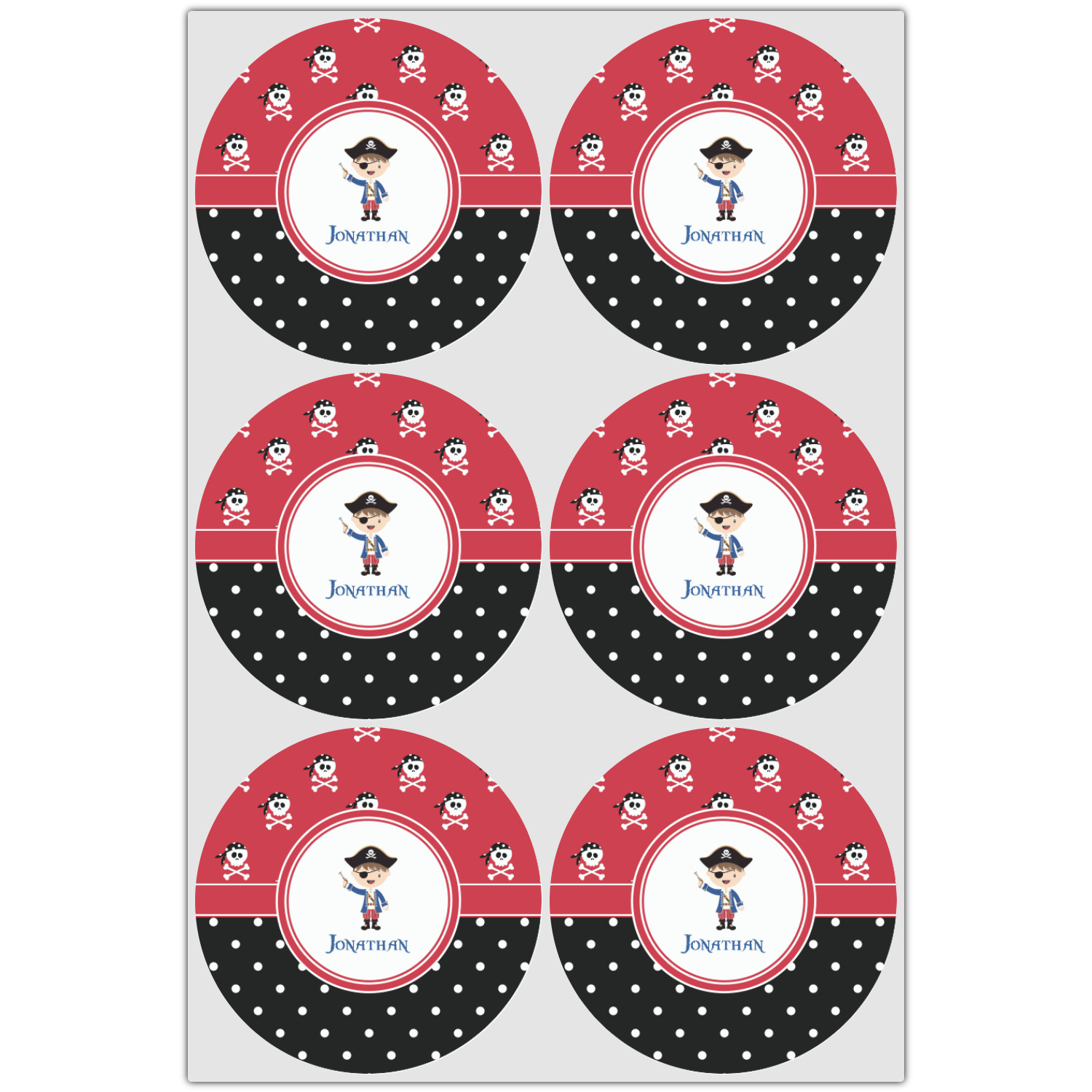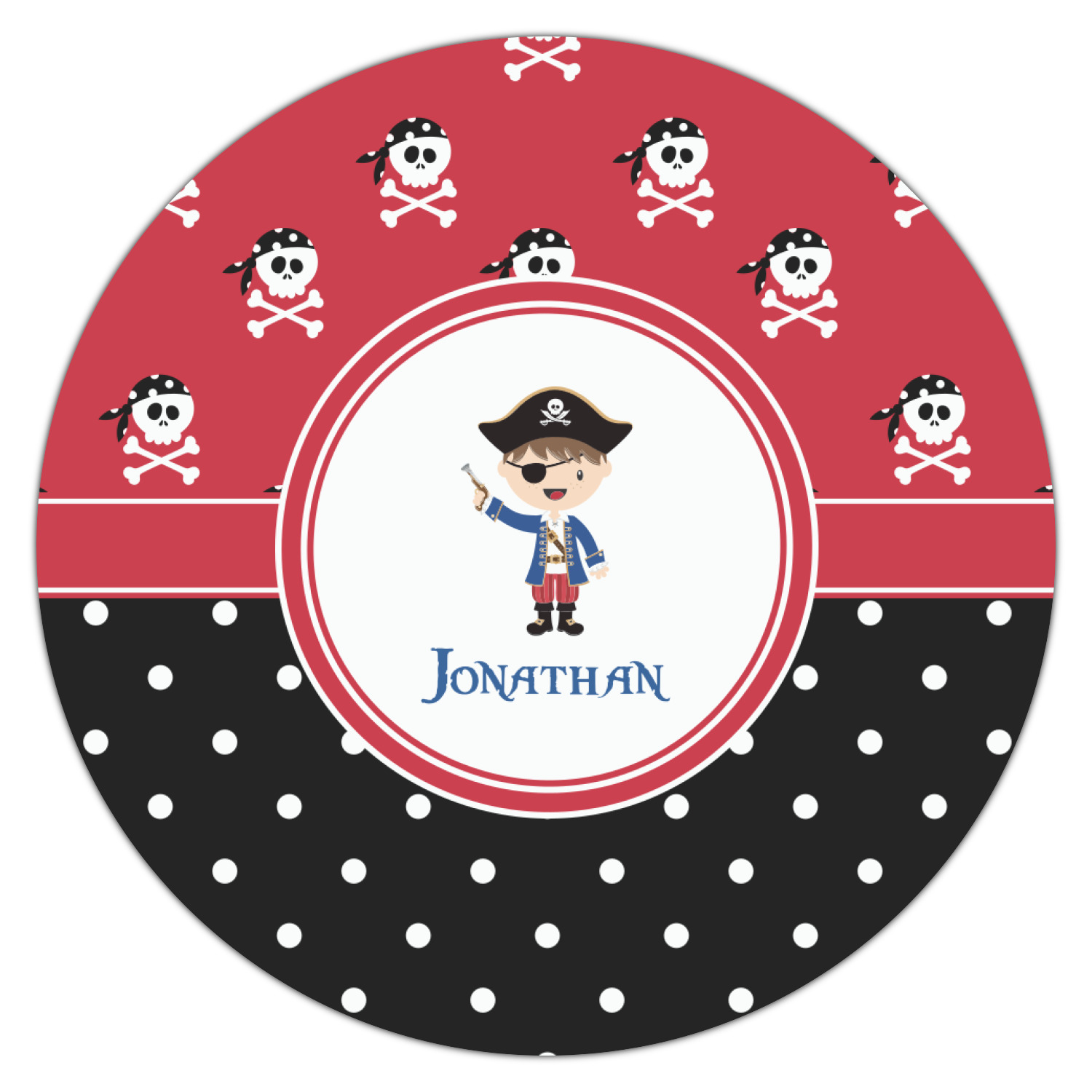 A wide band of red, trimmed in white highlight the pirate boy in the circle label. Add your personalization in the label to complete the look.