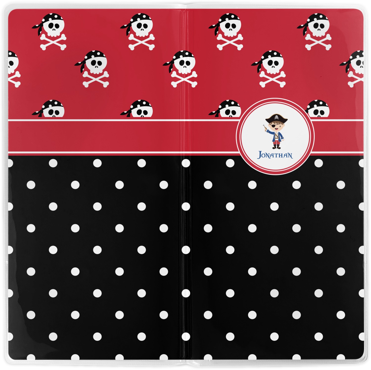 A wide band of red, trimmed in white highlight the pirate boy in the circle label. Add your personalization in the label to complete the look.