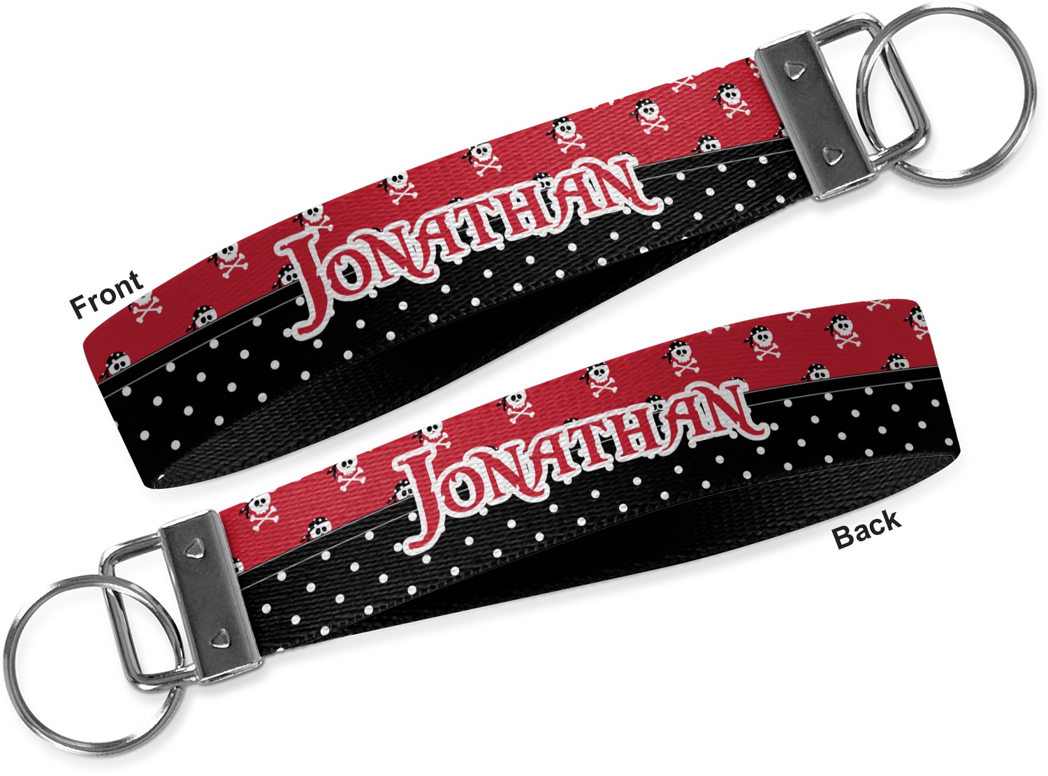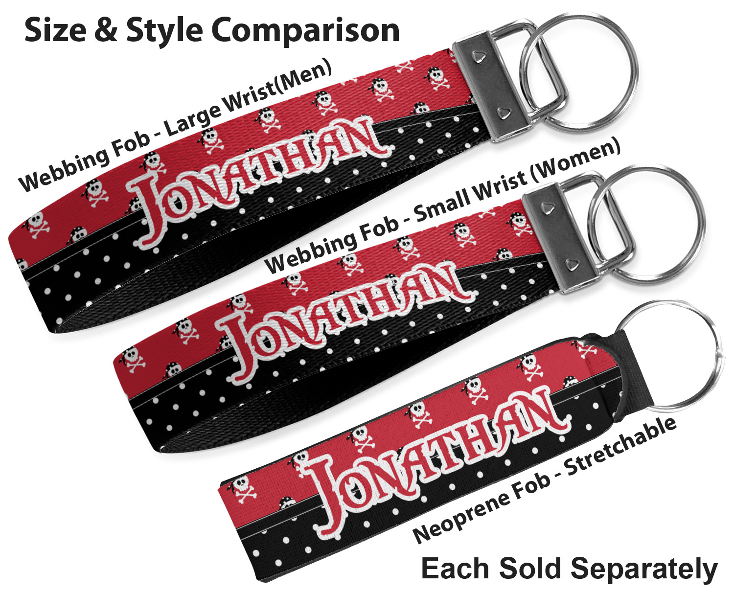 These key fob keychains are made from a polyester weave, right here in the USA. They feature a silver, metal clasp, attached to a round keyring. The piece gives the personalized wristlet a beautiful, finished look. Your customized design is printed on the outside of the keychain strap. We carry these wristlets in two sizes: small, which is 5 inches in width, and large, which is 5.5 inches in width.