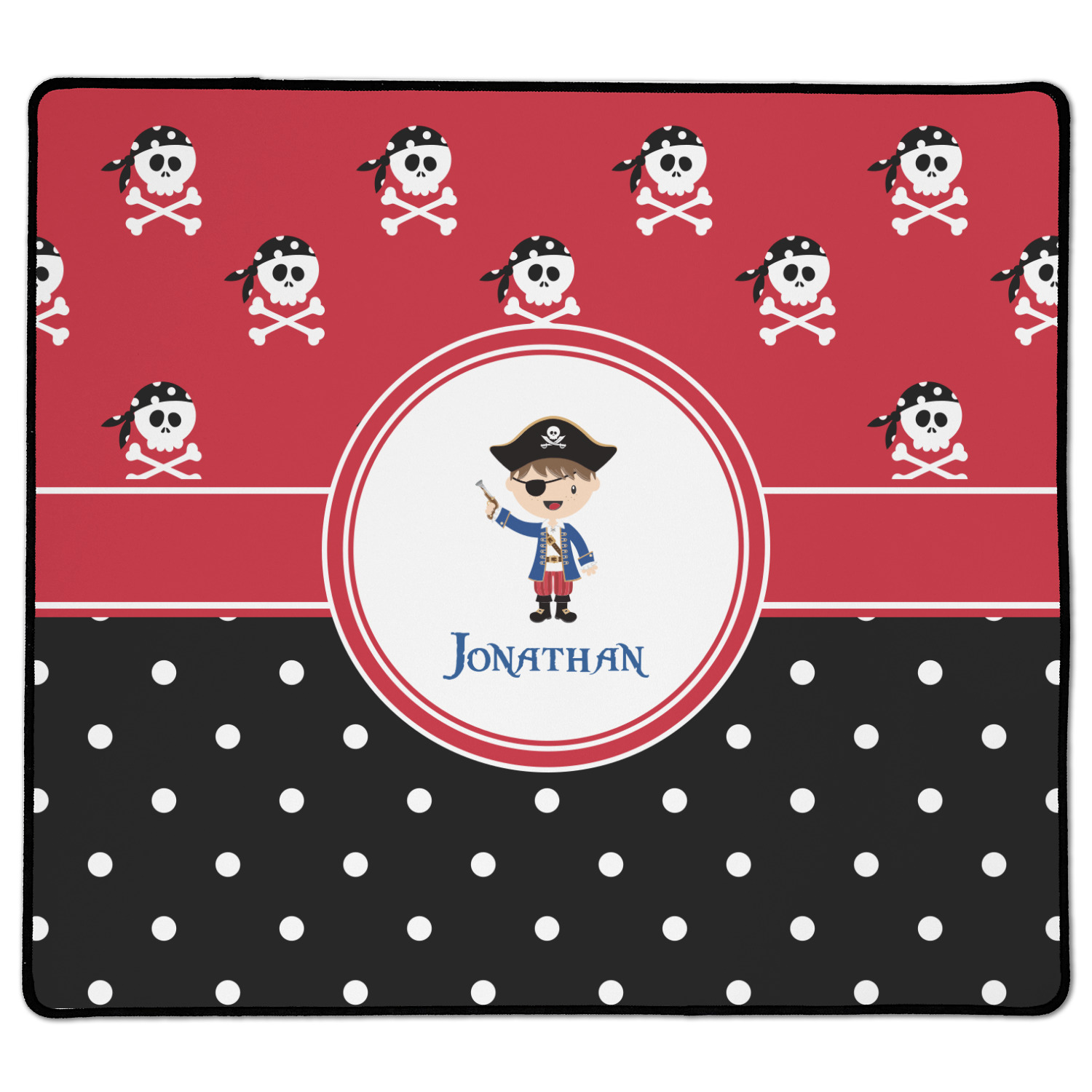A wide band of red, trimmed in white highlight the pirate boy in the circle label. Add your personalization in the label to complete the look.