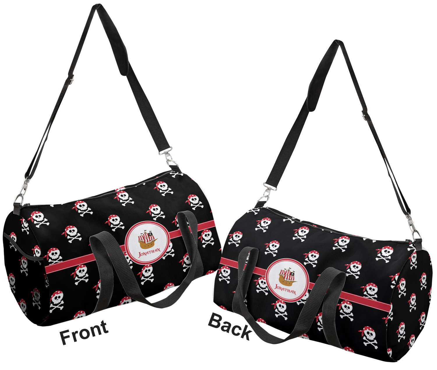 This duffle is a sturdy bag made of a canvas material. It comes in two sizes: Small (19"W x 9.5"H x 9.5"D) and Large (23"W x 12"H x 12"D). The bag is a cylindrical shape with a black adjustable strap and two handles. On one side is an elastic pouch to put a waterbottle or other small item. Your product will be sublimated with your design and is able to be designed on the front, back, and sides. Be sure to remember that the straps may cut into parts of your design if you upload your own artwork.