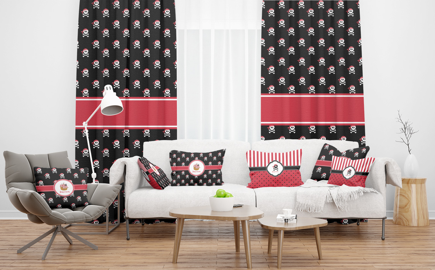 Pillage and plunder is the name of the game with this pirate design. Set on a backdrop of black, the skull and crossbones, sporting red and white polka dot dew rags, are the showcase in this design. A wide band of red trimmed in white bring these classic colors together.