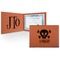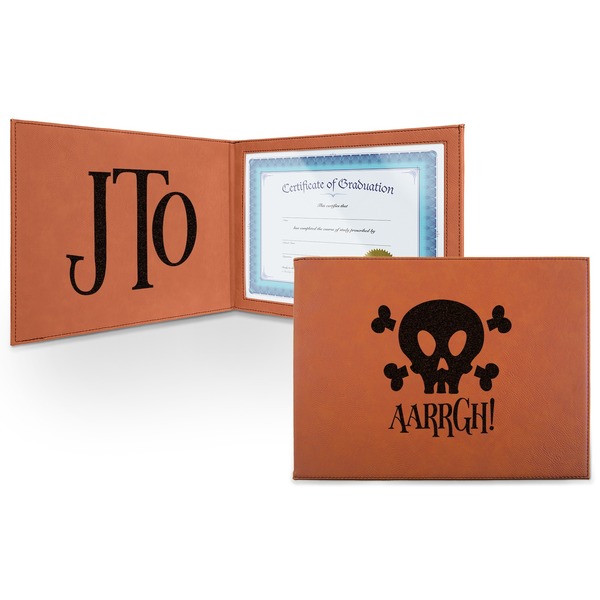 This cognac-colored, leatherette certificate jacket is the ideal way to display or store your hard-earned certificate. When closed, the custom certificate holder measures at 12 by 9 inches. The interior of the certificate cover includes a clear, vinyl window to encase your diploma. The window measures at around 10.5 by 7.5 inches and can accommodate a diploma that measures at up to 8.5 by 11 inches. You can either choose to have your customization laser engraved on the front and interior, or solely the front.