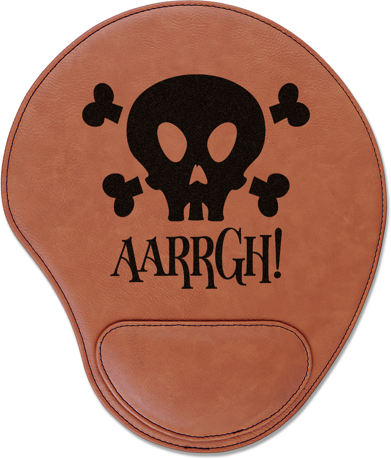 In a rounded shape, this mouse pad is made of a luxurious, cognac-colored leatherette. The nature of this material allows your mouse to glide smoothly across its surface. Strong stitching lines the edges to guarantee stability and strength. As added support for tired wrists, your personalized mouse pad features a supportive wrist rest at its bottom. This model measures at 10.25" x 9", while its wrist pad is approximately 5" x 2.75", with a thickness of 0.75". Your personalized design is laser engraved into the front face of this mouse pad.