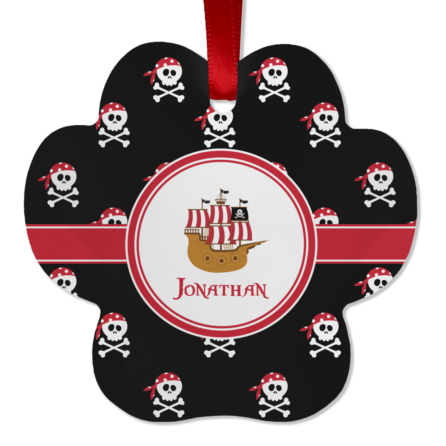 Pillage and plunder is the name of the game with this pirate design. Set on a backdrop of black, the skull and crossbones, sporting red and white polka dot dew rags, are the showcase in this design. A wide band of red trimmed in white bring these classic colors together.