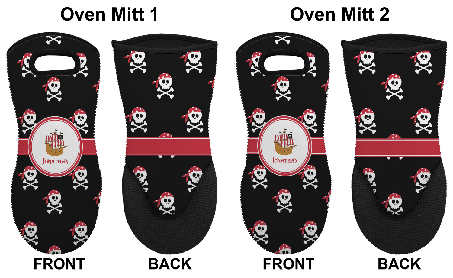 These heat resistant gloves are made entirely of a durable neoprene; the front features a softer texture, while the palm's side has a textured surface, meant to handle heat up to 500 degrees Fahrenheit. Thick, heavy duty stitching connects the two sides. A small, oval cutout appears on the front, and can be used to hang and store the mitt. Your personalization appears on the front, and the upper part of the back of the mitt. The style of these oven mitts are suitable for both the right and left hand, depending on your needs. If you need one for each hand, be sure to order two!