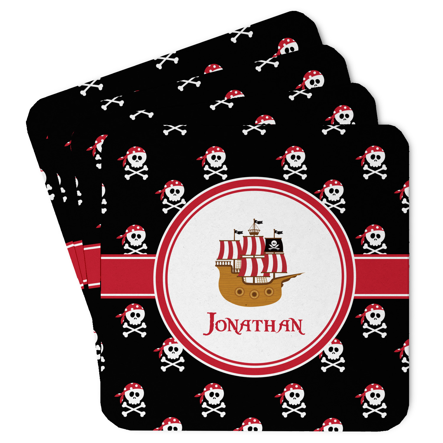 Pillage and plunder is the name of the game with this pirate design. Set on a backdrop of black, the skull and crossbones, sporting red and white polka dot dew rags, are the showcase in this design. A wide band of red trimmed in white bring these classic colors together.