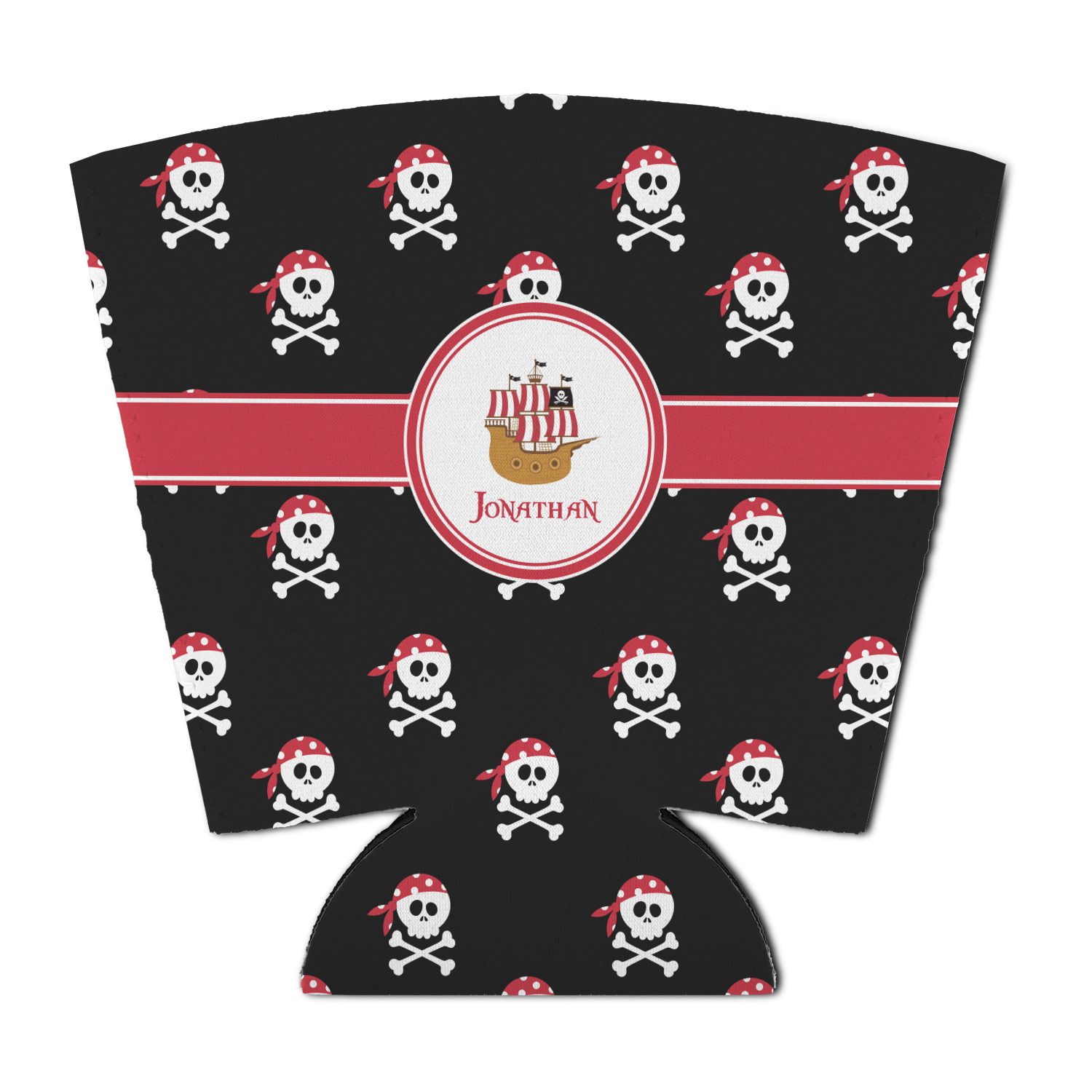 Pillage and plunder is the name of the game with this pirate design. Set on a backdrop of black, the skull and crossbones, sporting red and white polka dot dew rags, are the showcase in this design. A wide band of red trimmed in white bring these classic colors together.