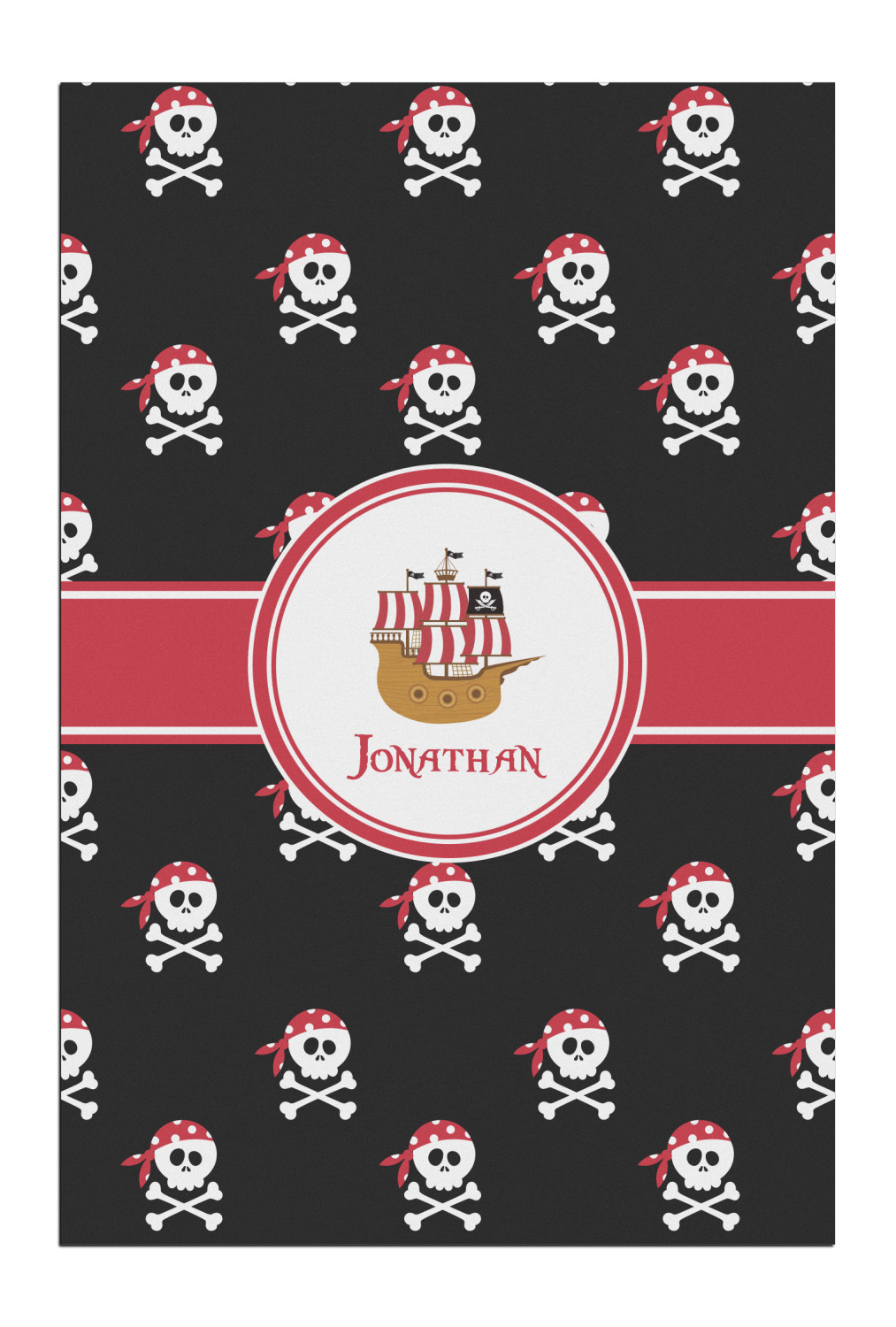 Pillage and plunder is the name of the game with this pirate design. Set on a backdrop of black, the skull and crossbones, sporting red and white polka dot dew rags, are the showcase in this design. A wide band of red trimmed in white bring these classic colors together.