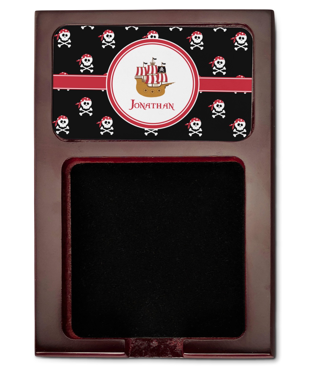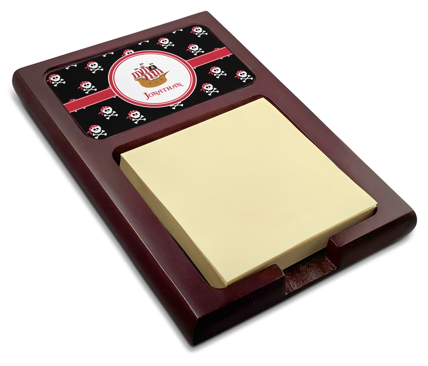 Crafted from a fine mahogany, this post it note holder is in the shade of a dark, cherry color. The dispenser itself is about 4.25 by 6.25 by 0.75 inches. You can place your 3 by 3 inch sticky notes in the indentation below the nameplate. We print your customization onto the nameplate that rests above the velvety indentation.