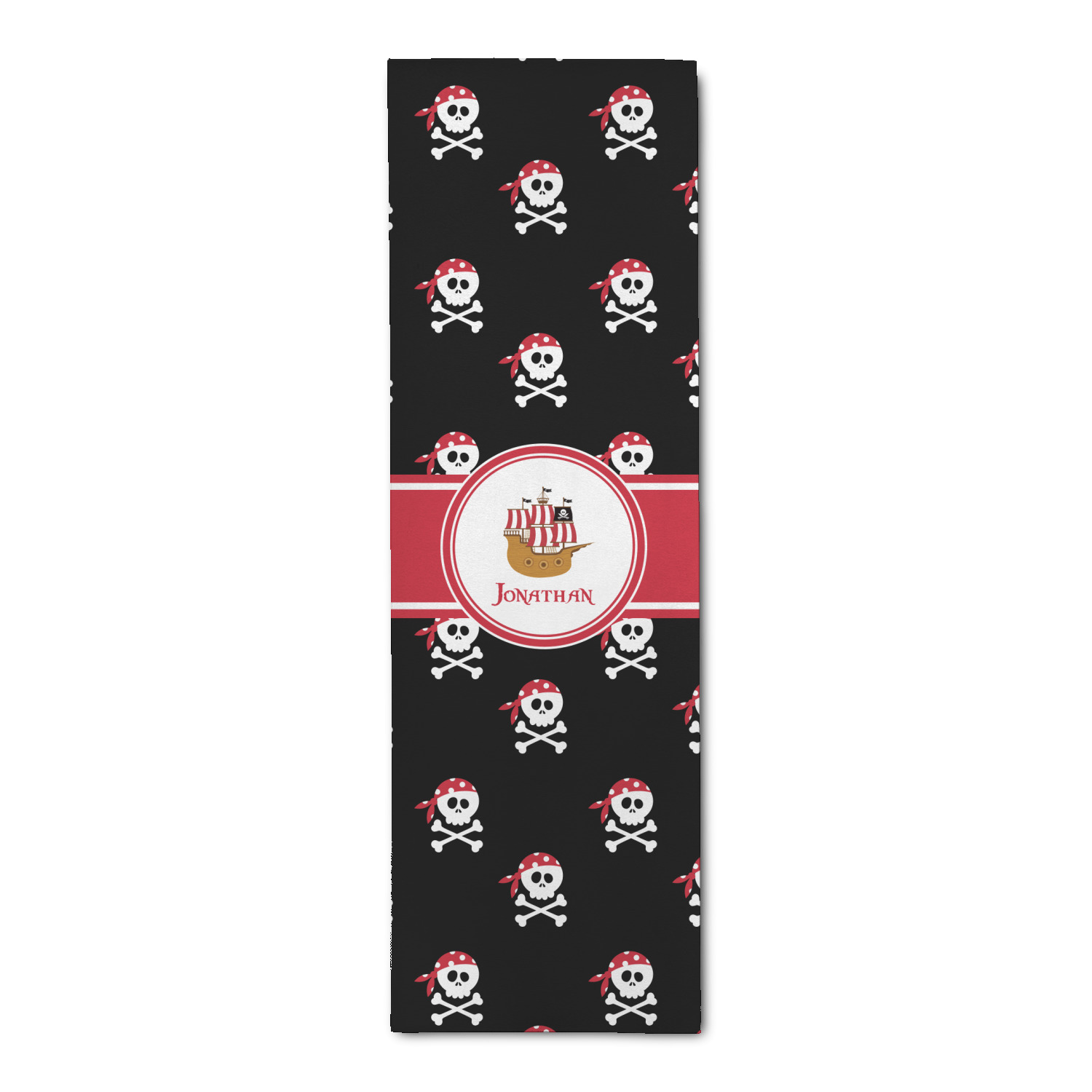 Pillage and plunder is the name of the game with this pirate design. Set on a backdrop of black, the skull and crossbones, sporting red and white polka dot dew rags, are the showcase in this design. A wide band of red trimmed in white bring these classic colors together.