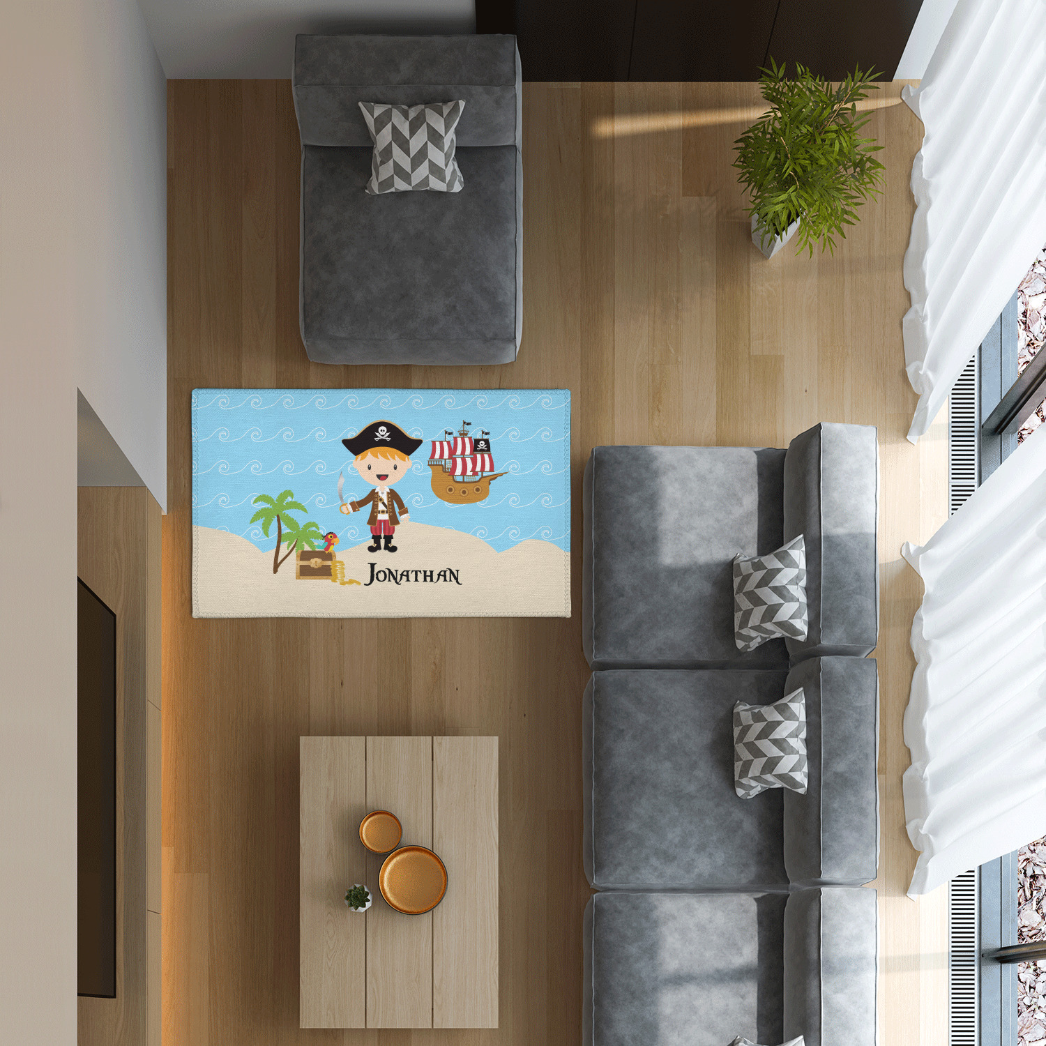 Do you have a wee laddie that dreams of great adventures on the sea? If yes, then bring his imagination to life with this great pirate design. Our little pirate is set on an ocean shore with his treasure chest, his pirate ship is set off in the background waiting for his return.