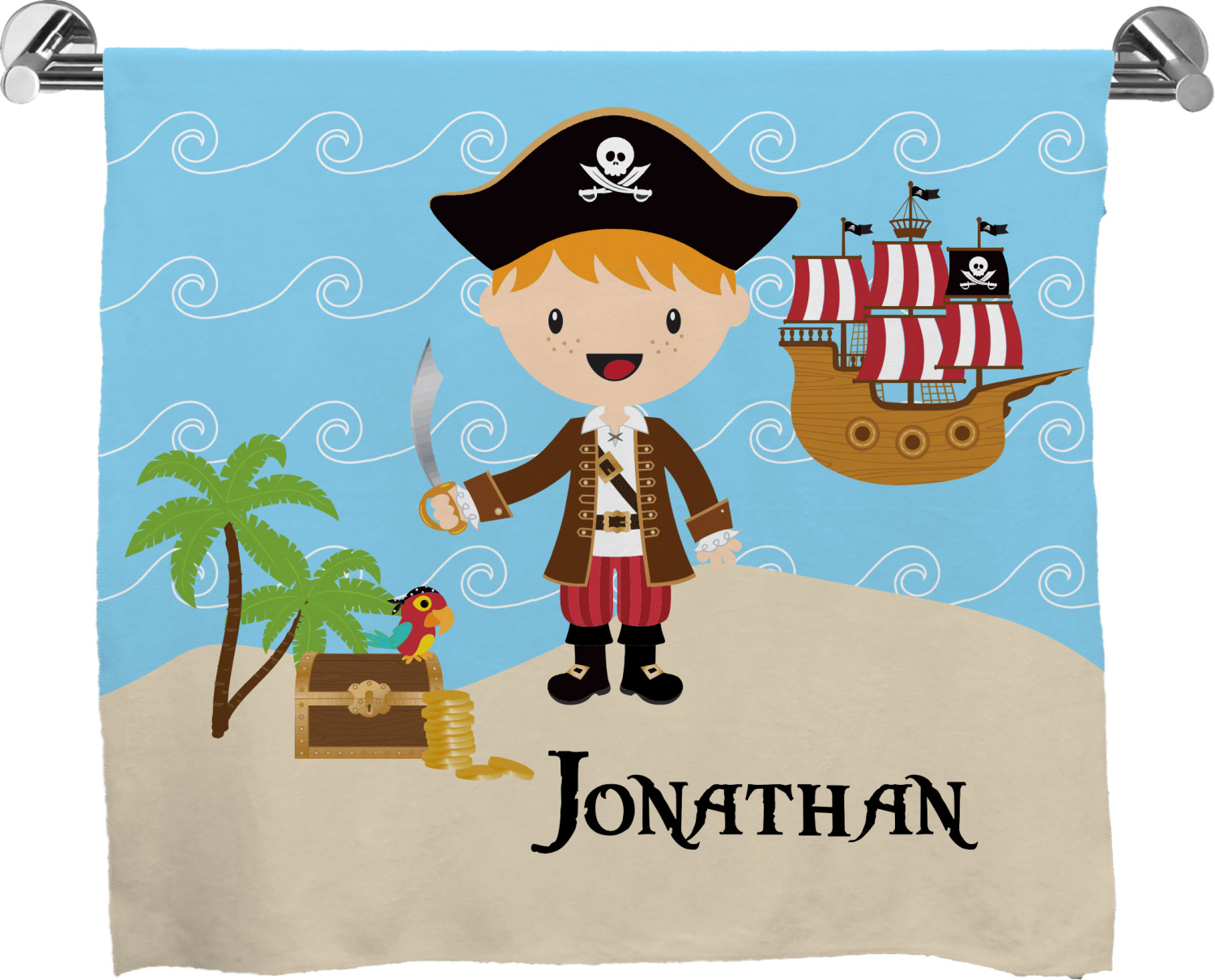 Do you have a wee laddie that dreams of great adventures on the sea? If yes, then bring his imagination to life with this great pirate design. Our little pirate is set on an ocean shore with his treasure chest, his pirate ship is set off in the background waiting for his return.