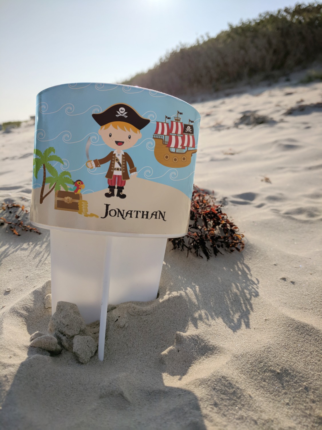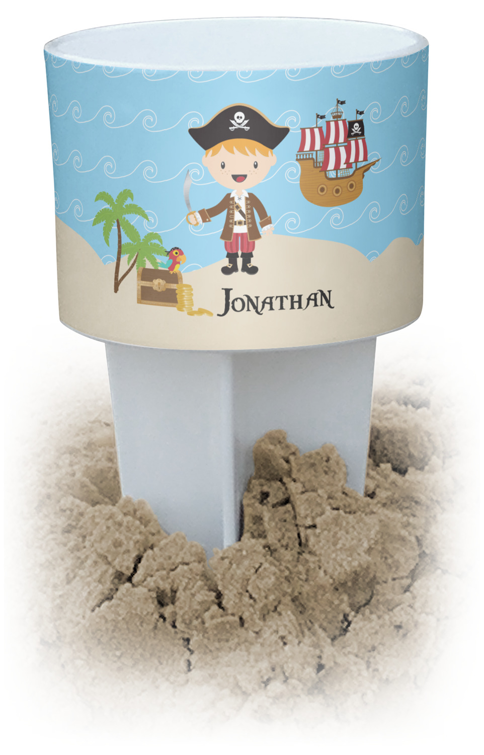 This cup holder has a large stake at its bottom that anchors it to the sand or ground below, while the cup holder rests above the stake. The entire drink holder is made of durable plastic and displays your customization around the cup holder portion. We sell these personalized beach spikers in two different colors: black and white.