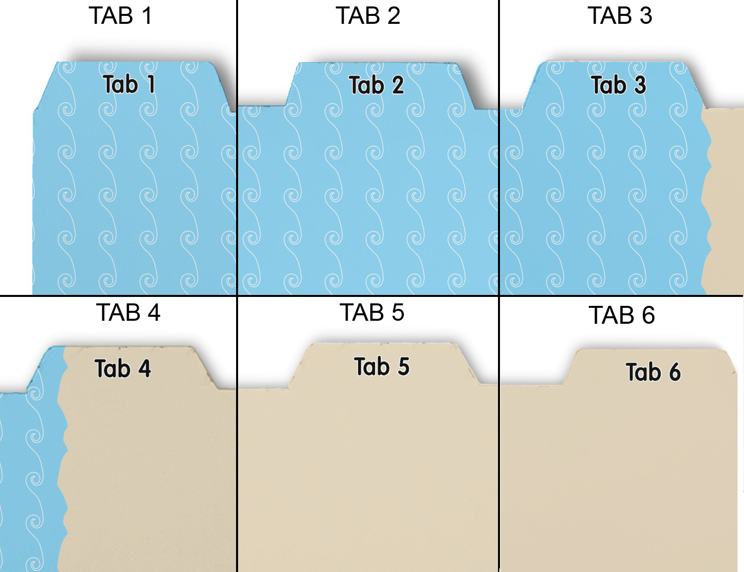 Whether you use binders at school or at work, we have designs to suit all of them. Available in 5 or 6 tab sets, you are sure to find a set to suit your needs. The back of each one is white and can be used to take notes, write vital information on, etc.