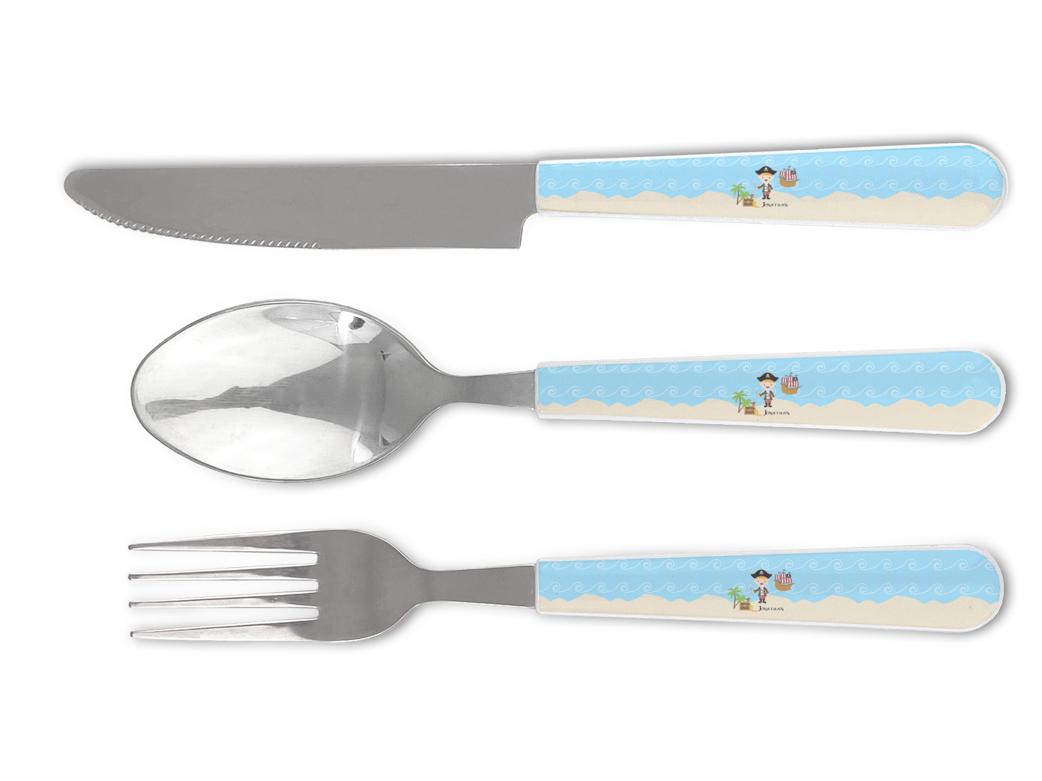 This set features a fork, a spoon and a knife. The fork has 4 prongs, the spoon is a nice size for adults and the knife has a short serrated section for cutting as well as a smooth section for spreading. The pieces in this silverware set are crafted from Stainless Steel with a durable plastic handle.