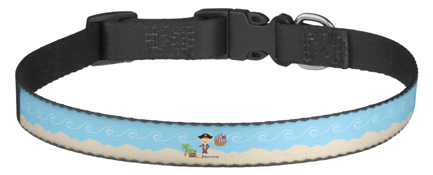 This sturdy collar, made from a durable nylon weave, will outlive your dog's episodes of excited tugging and pulling. Courtesy of its thick plastic buckle and adjuster, this collar is adjustable and accommodating of any dog. Structurally, the collar is a single piece of nylon weave that is sewn together, and features a solid metal loop where you can attach a leash or dog tag. We print and display your dog's name and pattern across the middle of the personalized dog collar.