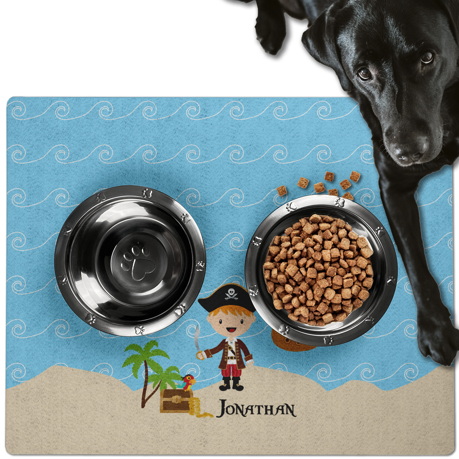 This dog bowl mat, fabricated from polyester, proudly displays your customized design on its top, while its bottom includes a non-slip rubber. This feature allows it to remain firmly in place, even when your dog spills his/her water. With 3 sizes available (18" x 12", 24" x 18", 30" x 24"), the pet food mat has ample space for both a food and water bowl for any sized dogs. Though specified for dogs' use, these mats are also a splendid option for cats.