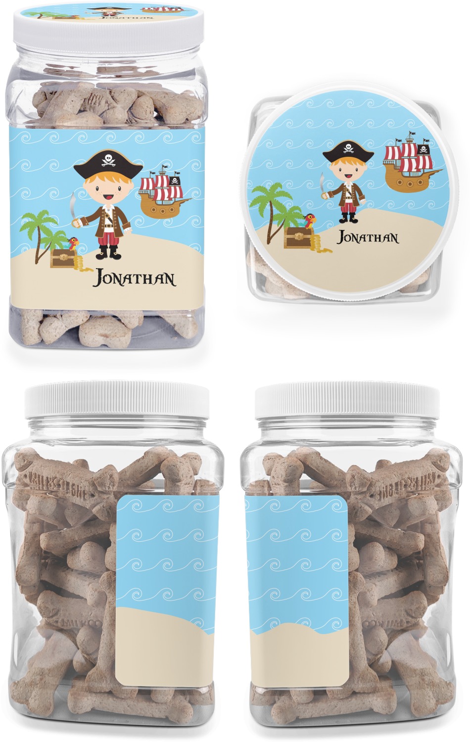 This half gallon jar, made from a sturdy plastic, is the perfect way to keep treats from any naughty pet paws, while still keeping them ready on hand for when your pup performs an impressive trick. This dog cookie jar features a screw-on, white lid that displays your personalized design on a vinyl sticker. We apply another customized sticker that wraps around the front and sides of the jar. Our dog treat jar also has indentations on the rear ends of the sides, which allows for convenient handling, and its square frame allows for easy storage.