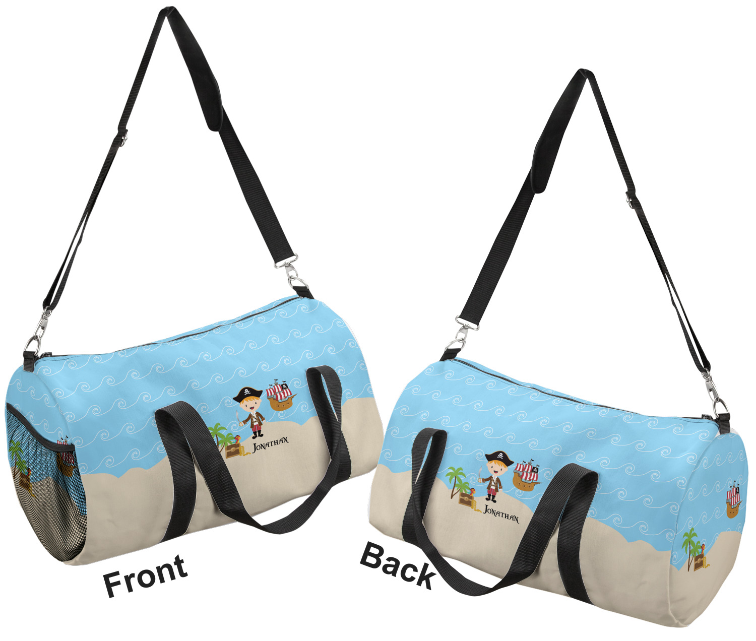 This duffle is a sturdy bag made of a canvas material. It comes in two sizes: Small (19"W x 9.5"H x 9.5"D) and Large (23"W x 12"H x 12"D). The bag is a cylindrical shape with a black adjustable strap and two handles. On one side is an elastic pouch to put a waterbottle or other small item. Your product will be sublimated with your design and is able to be designed on the front, back, and sides. Be sure to remember that the straps may cut into parts of your design if you upload your own artwork.