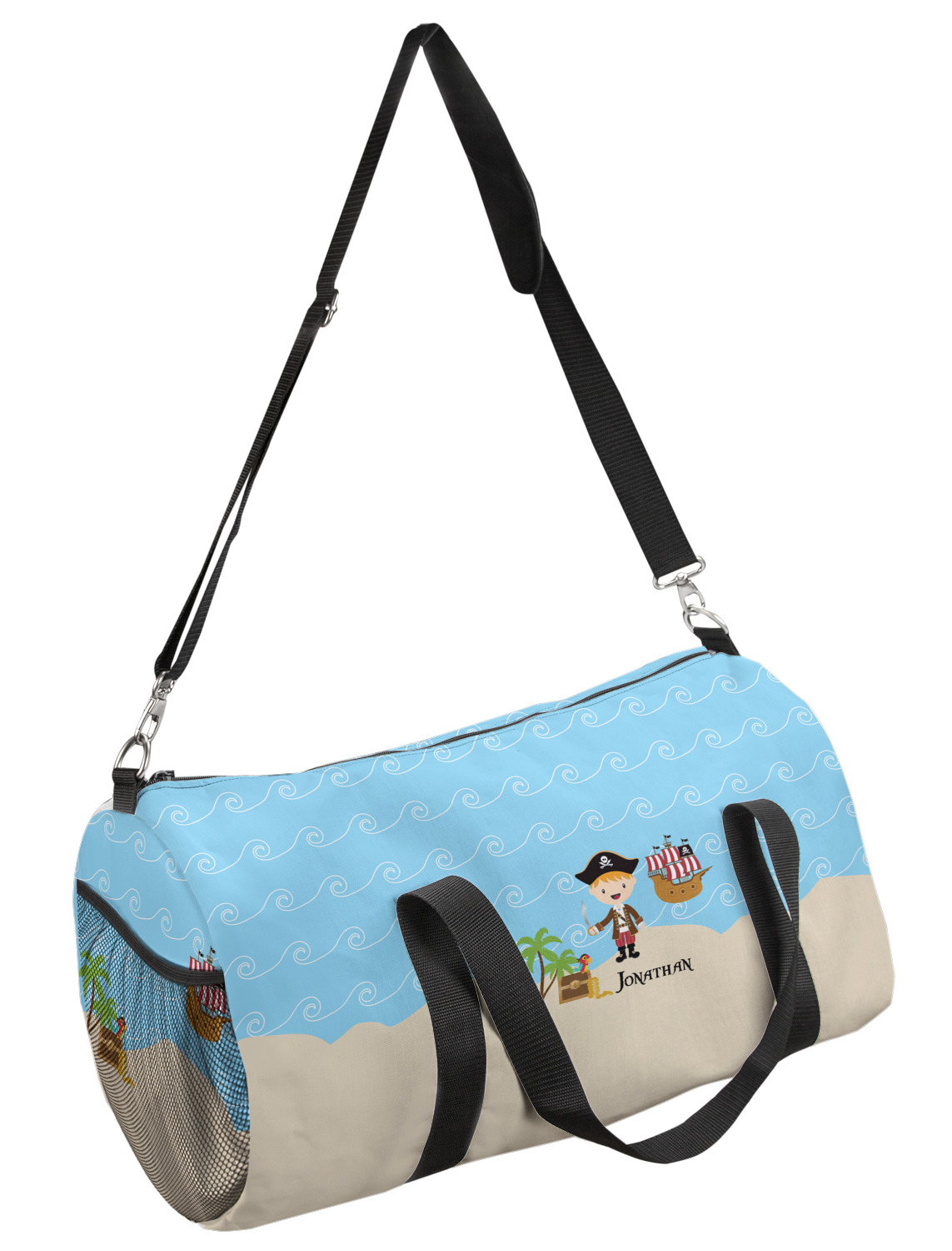 This duffle is a sturdy bag made of a canvas material. It comes in two sizes: Small (19"W x 9.5"H x 9.5"D) and Large (23"W x 12"H x 12"D). The bag is a cylindrical shape with a black adjustable strap and two handles. On one side is an elastic pouch to put a waterbottle or other small item. Your product will be sublimated with your design and is able to be designed on the front, back, and sides. Be sure to remember that the straps may cut into parts of your design if you upload your own artwork.