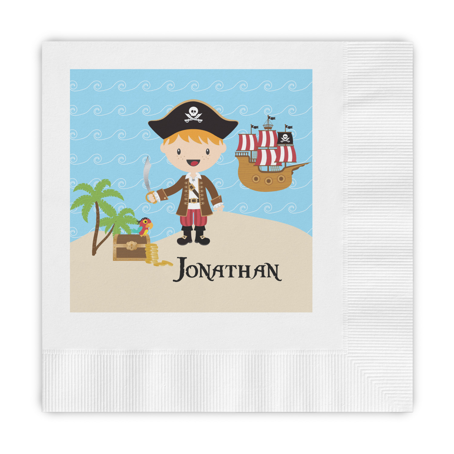 Do you have a wee laddie that dreams of great adventures on the sea? If yes, then bring his imagination to life with this great pirate design. Our little pirate is set on an ocean shore with his treasure chest, his pirate ship is set off in the background waiting for his return.