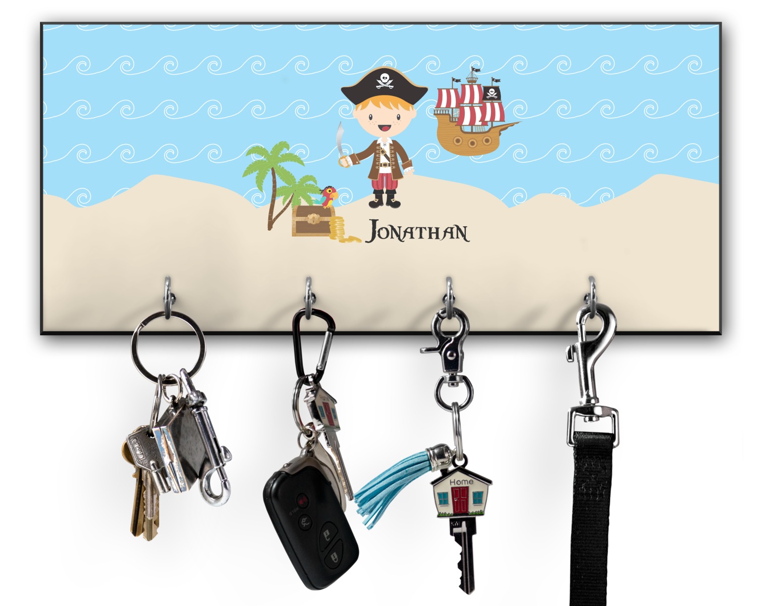 This 11" x 5" key hanger is made of sturdy wood and has four metal hooks lining the bottom. This is the perfect size for a family with several drivers. Not only can you hang keys on it though, but pet leashes and other small items. The board is black on the sides and back and is printed with the design of your choice on the front.