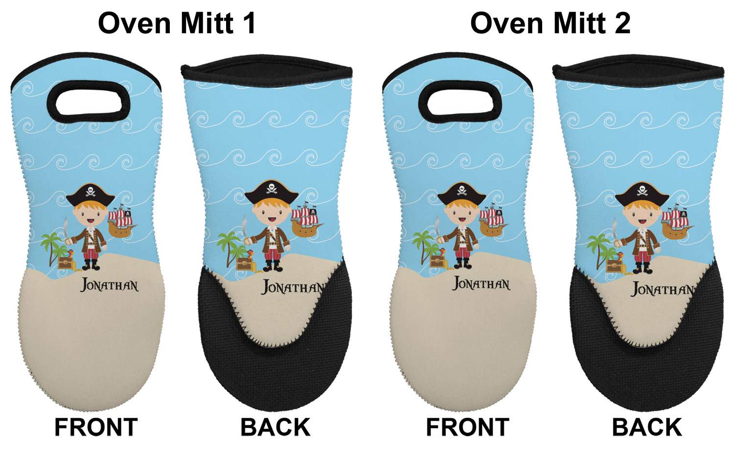 These heat resistant gloves are made entirely of a durable neoprene; the front features a softer texture, while the palm's side has a textured surface, meant to handle heat up to 500 degrees Fahrenheit. Thick, heavy duty stitching connects the two sides. A small, oval cutout appears on the front, and can be used to hang and store the mitt. Your personalization appears on the front, and the upper part of the back of the mitt. The style of these oven mitts are suitable for both the right and left hand, depending on your needs. If you need one for each hand, be sure to order two!