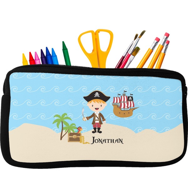 Built from durable neoprene, these pencil pouches, are water resistant, and prevent leaking ink from spilling into your backpack or purse. These custom pencil cases secure with a robust, black zipper. We print your personalized design on the front of this pouch, while the remaining sides a simple black color. These colored pencil cases [880] are sold in two sizes; our smaller version measures at 8.5 by 4.5 inches, while the medium measures at 10.5 by 6.5 inches. The smaller size is more suitable for holding pencils and pens, while our medium size can accommodate pencil sharpeners, scissors, and erasers.