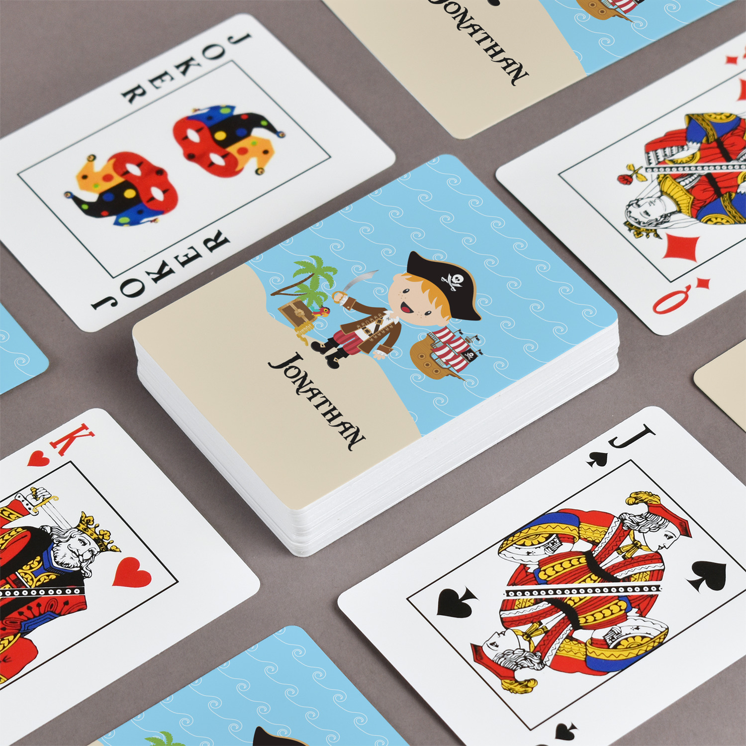 The customization / personalization is printed on the back side. The playing cards have a low gloss coating on both sides. The cards are packaged in a clear plastic box.