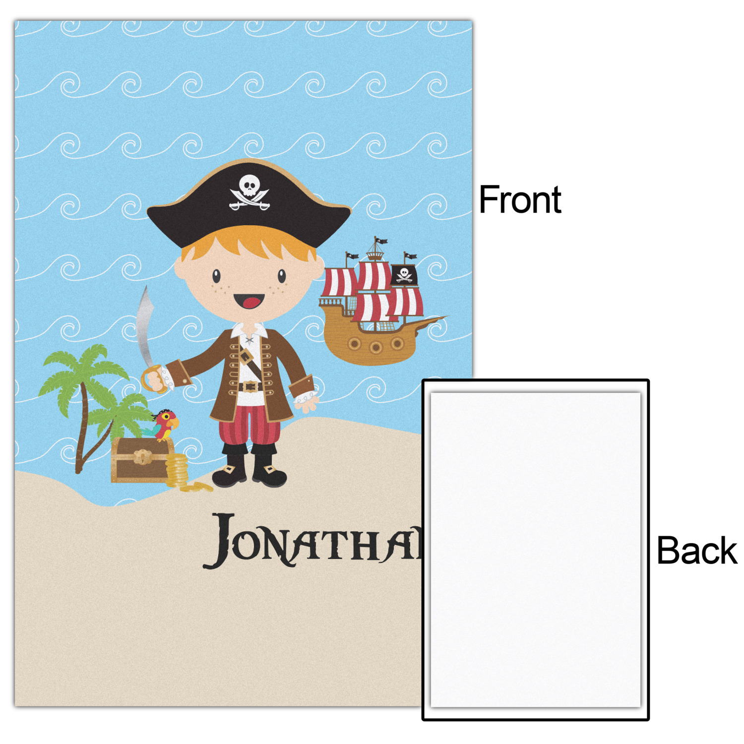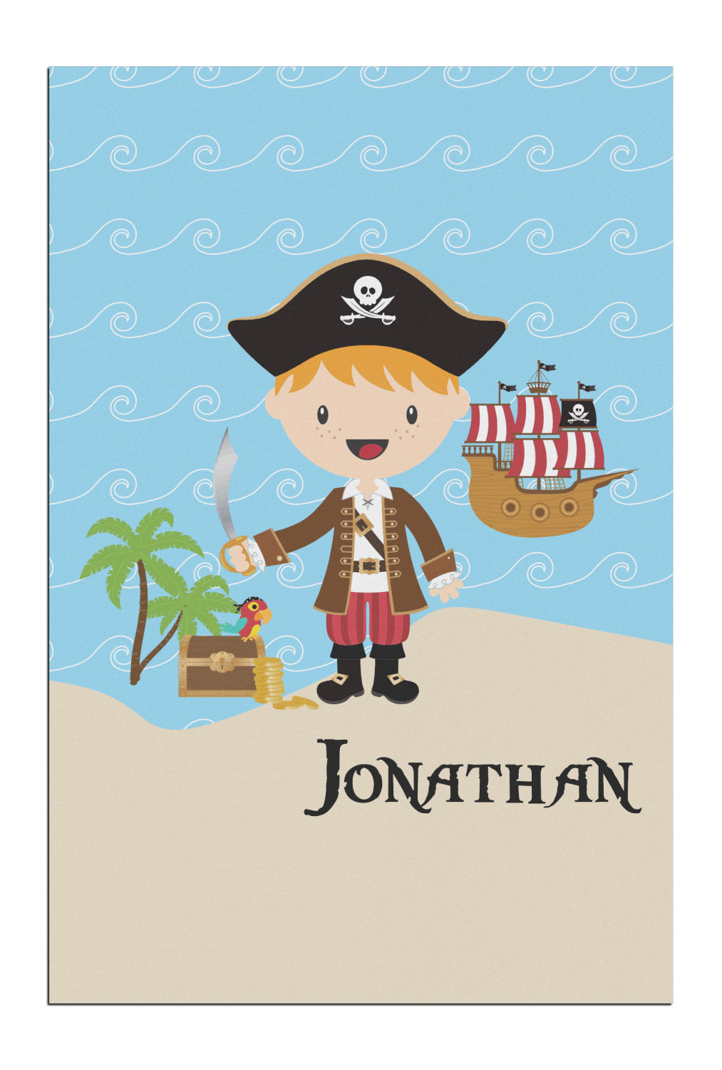 Do you have a wee laddie that dreams of great adventures on the sea? If yes, then bring his imagination to life with this great pirate design. Our little pirate is set on an ocean shore with his treasure chest, his pirate ship is set off in the background waiting for his return.