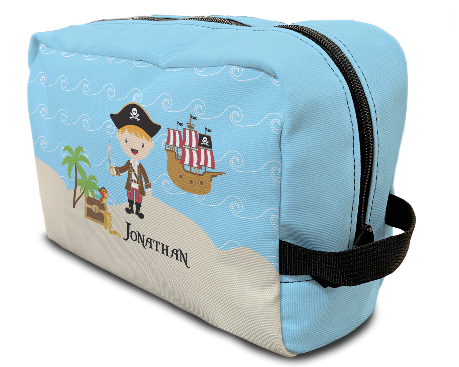 Our toiletry bag has the traditional dopp kit design i.e. a side to side zippered closure, giving you easy access to all the contents inside and a sturdy handle on one side of the bag. The canvas fabric for dopp kits is printed, then cut and sewn here in the USA.