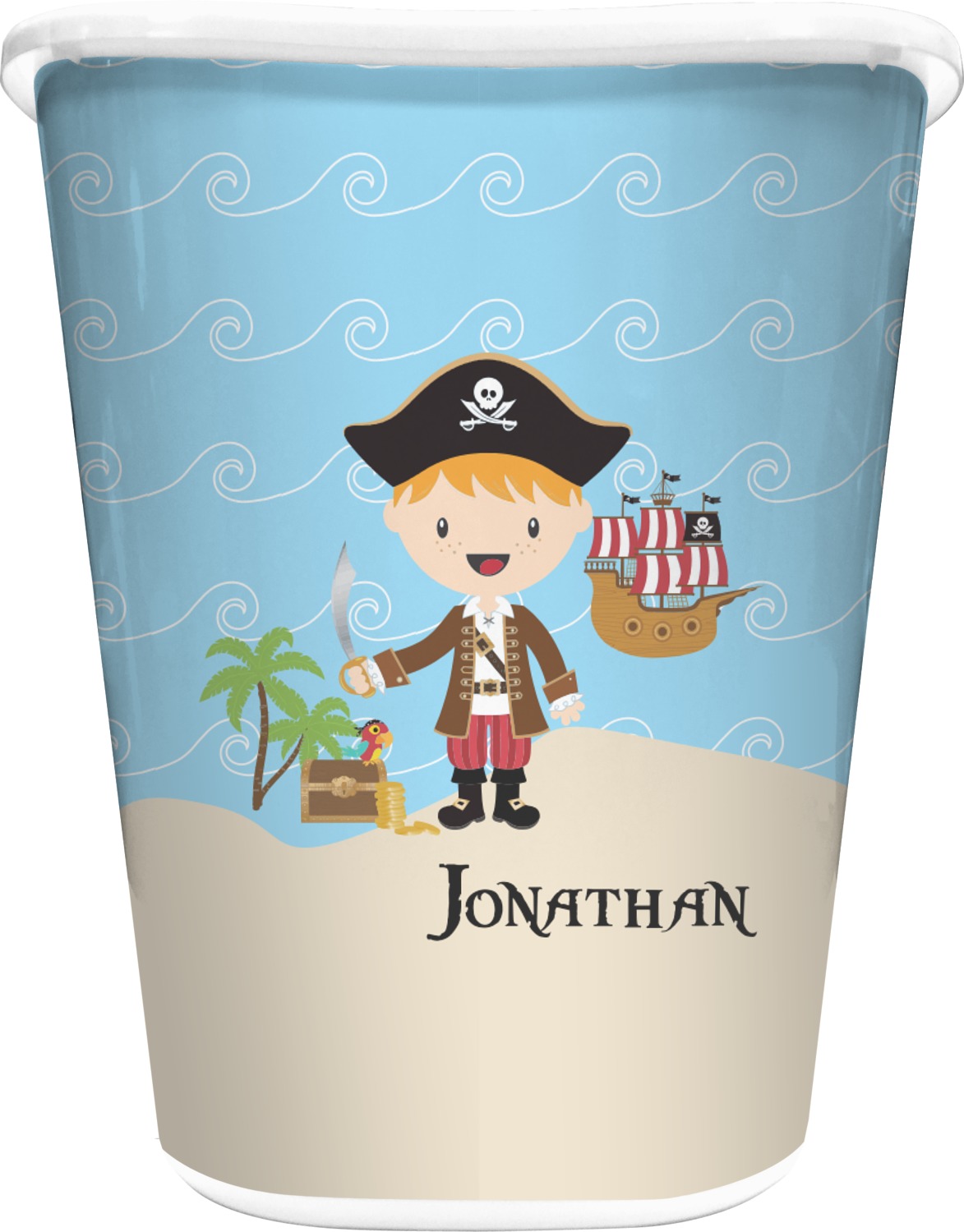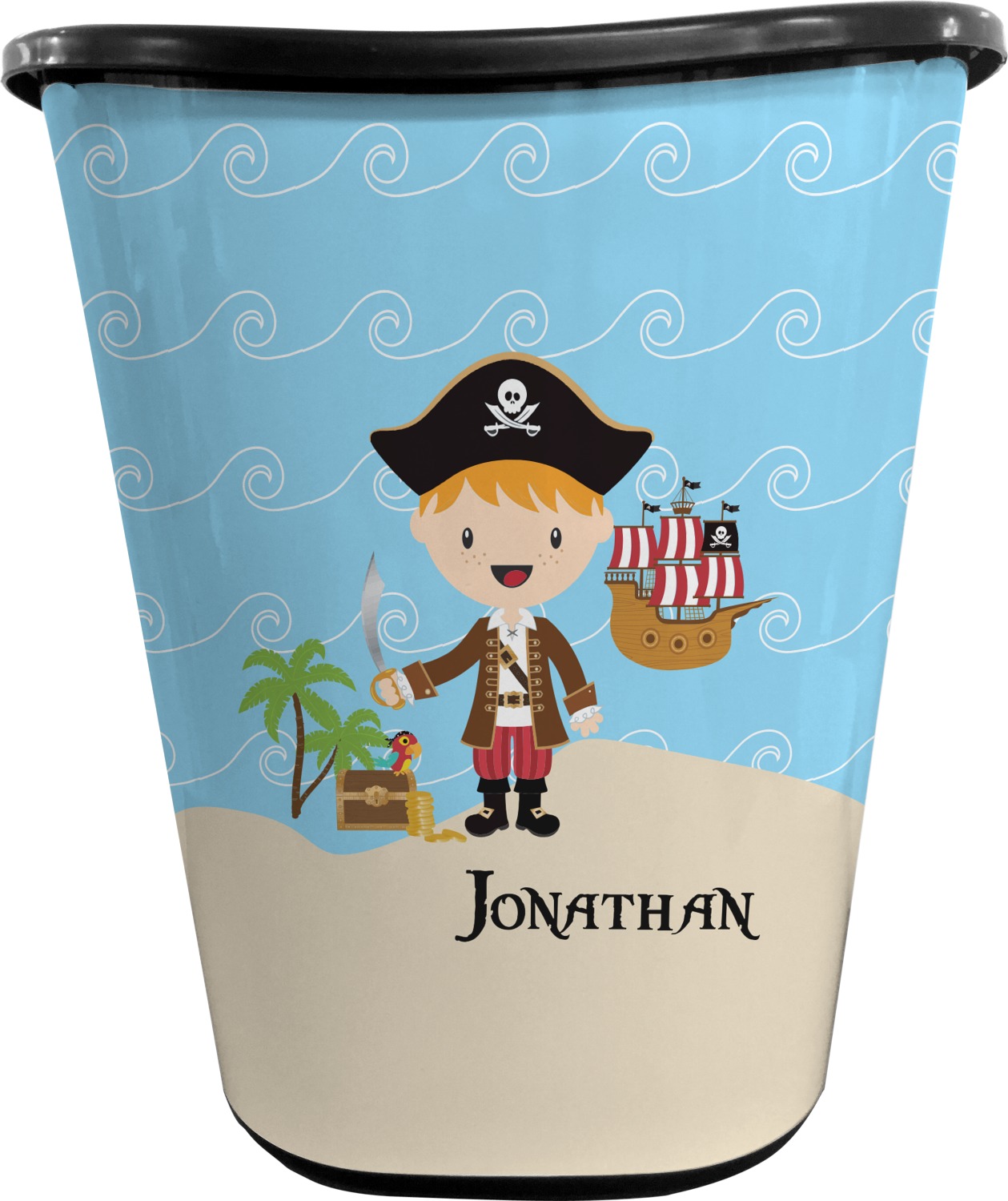 Do you have a wee laddie that dreams of great adventures on the sea? If yes, then bring his imagination to life with this great pirate design. Our little pirate is set on an ocean shore with his treasure chest, his pirate ship is set off in the background waiting for his return.